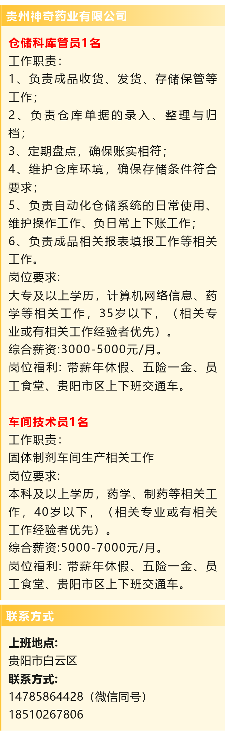 贵州神奇药业有限公司招聘!月薪可达7000元!五险一金!