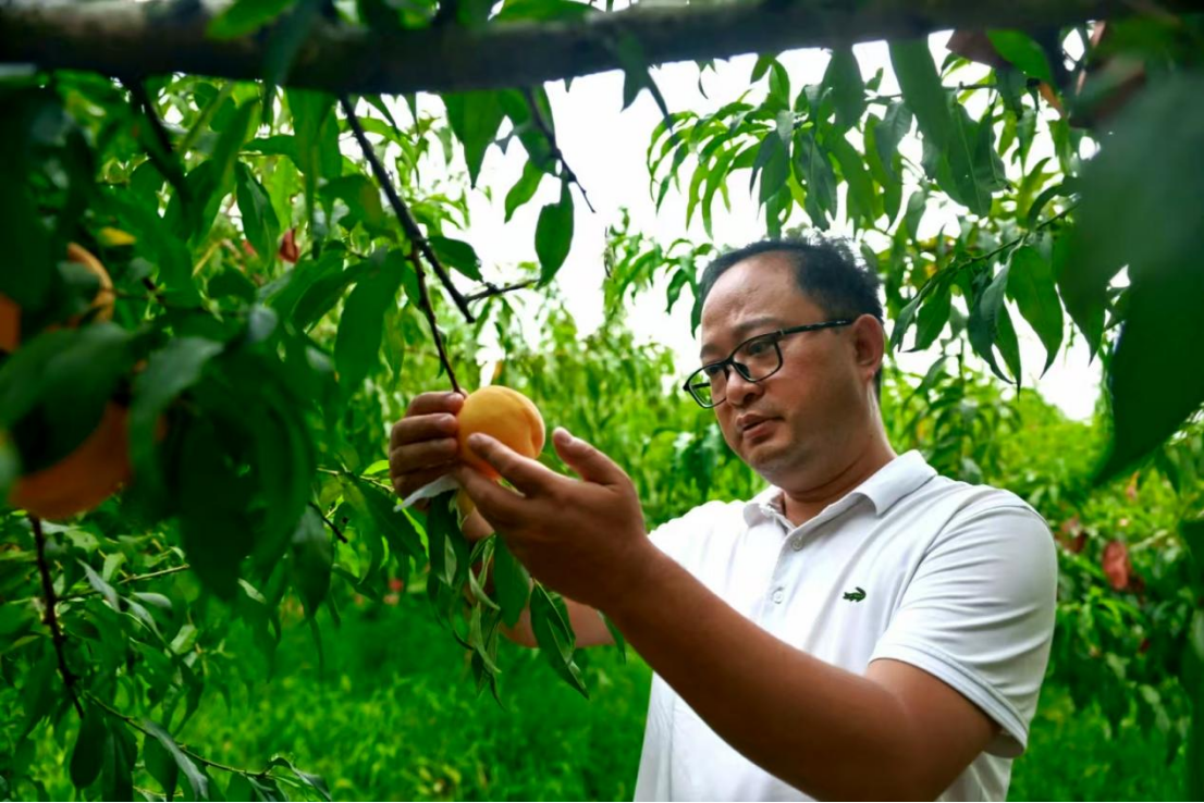 贵州水职院派驻甘龙村第一书记李永才在桃林里查看黄桃成熟情况(袁龙 摄)