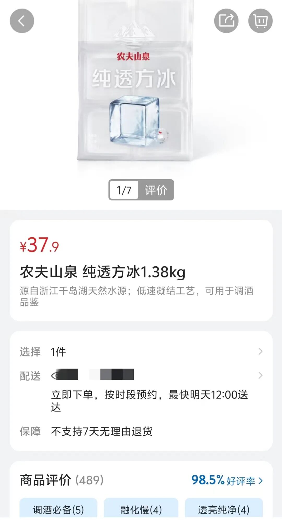 极目新闻记者通过山姆会员商店APP查询发现,确有该款冰块产品在售。产品名称为农夫山泉纯透方冰1.38kg,售价为37.9元,详情页介绍这款产品源自千岛湖天然水源,采用超低速凝结工艺,历经约42至48小时才得到纯透美观的方冰,不易融化,为专业品酒设计。消费者评价以好评居多,称这款方冰融化速度很慢,配酒水饮料正合适,也有少数消费者认为性价比较低。