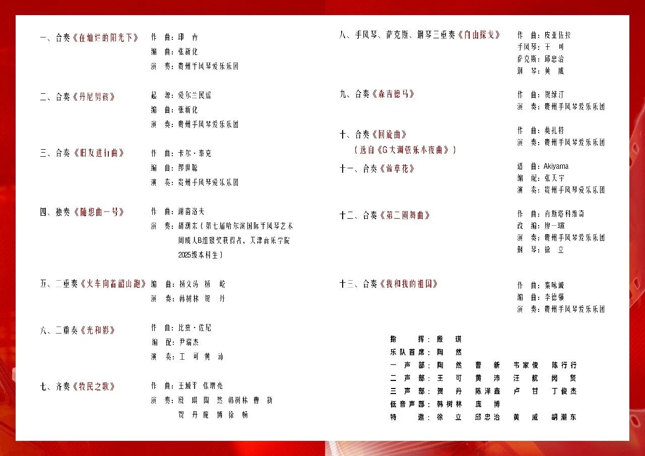 本场音乐会由贵州省文化馆、贵州省音乐家协会主办,贵州省手风琴学会、贵州手风琴爱乐乐团承办,坚持公益性与艺术性相统一,面向社会公众开放,诚邀广大音乐爱好者莅临欣赏。
