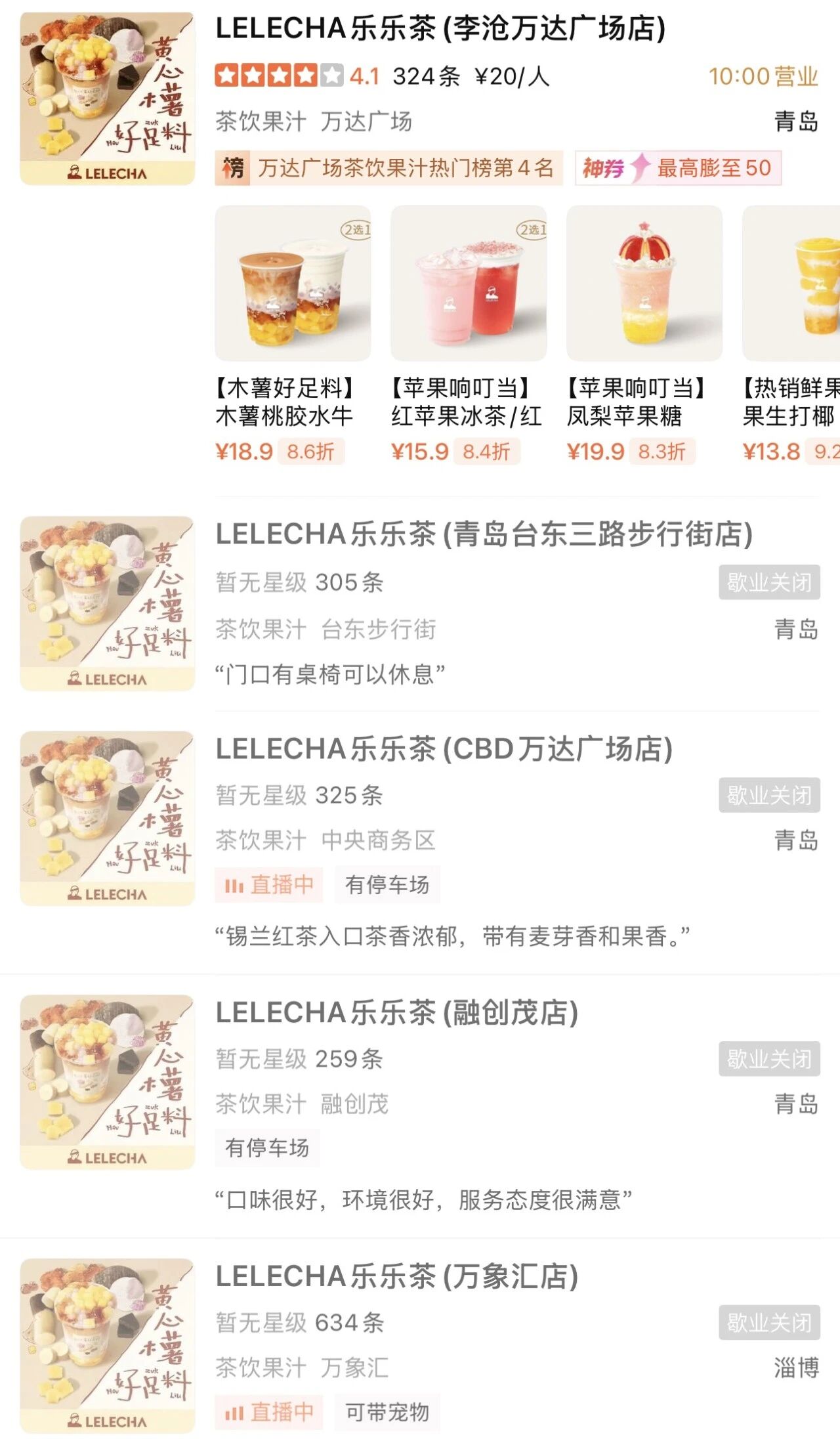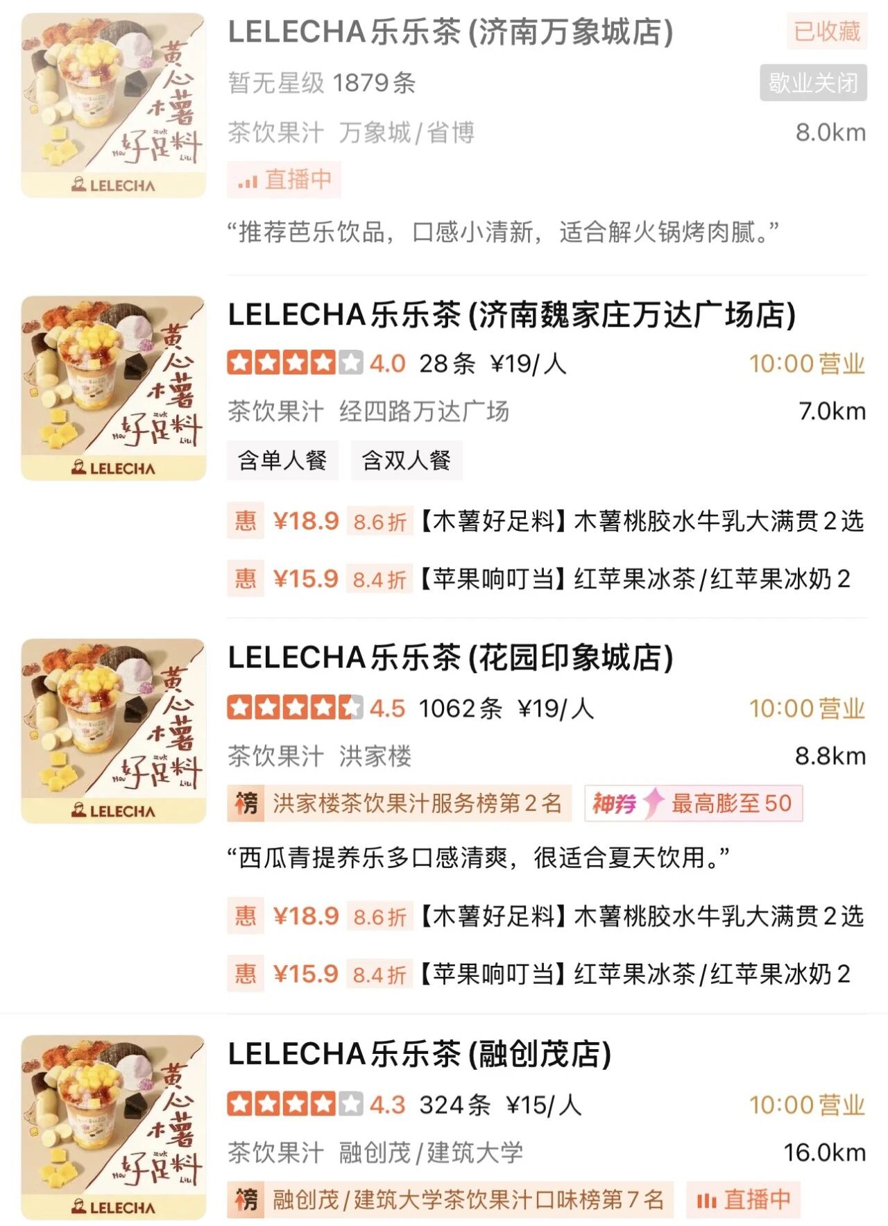 搜索发现,乐乐茶在山东多地均有门店,目前济南、青岛、淄博等地均有门店已显示“歇业关闭”。