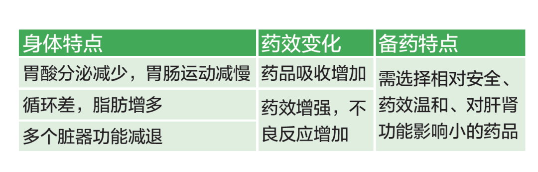 俗说:“家有一老,如有一宝。”但是随着年纪的增长,人身体的各个器官会逐渐退化,“身体零件不好使”所导致的各种问题就开始困扰着家里的老人。比如老年人腿脚不便,磕磕碰碰在所难免,糖尿病、高血压等慢性病导致的突发急症更是让每个家庭心急如焚。因此家有老人时,我们要关注老年人的每日用药和急救药品。要为家里老人备药,首先要了解他们的身体特点。下面我们用一张表格总结一下老年人的身体特点以及所备药物的特点 :