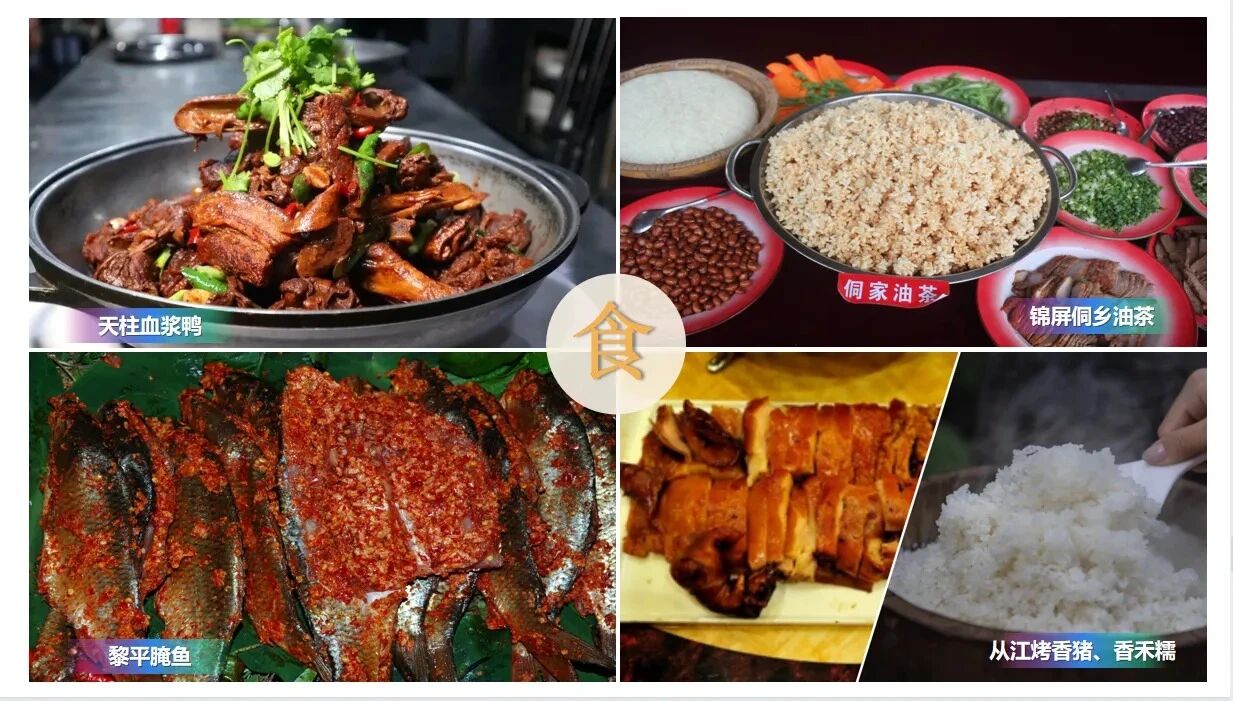 线路概览:凯里酸汤鱼——丹寨斗鸡——麻江蓝莓宴——黄平腌汤——施秉脆皮酸汤猪脚——镇远油炸粑——岑巩棉菜粑——三穗麻鸭——天柱血浆鸭——锦屏侗乡油茶——黎平腌鱼——从江小香猪、香禾糯——榕江牛羊瘪——雷山鱼酱酸——台江五彩饭——剑河红米粉