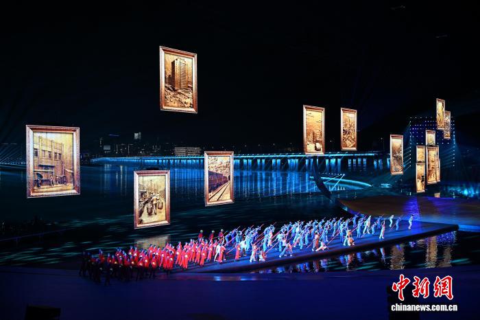 粤港澳三地和湖南交接全运会会旗后,一场名为“星辰大海”的文艺展演随即开始。