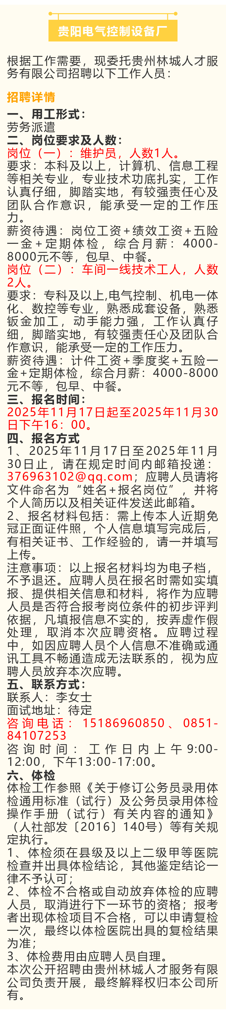 贵阳电气控制设备厂招聘!报名截止时间:2025年11月30日!