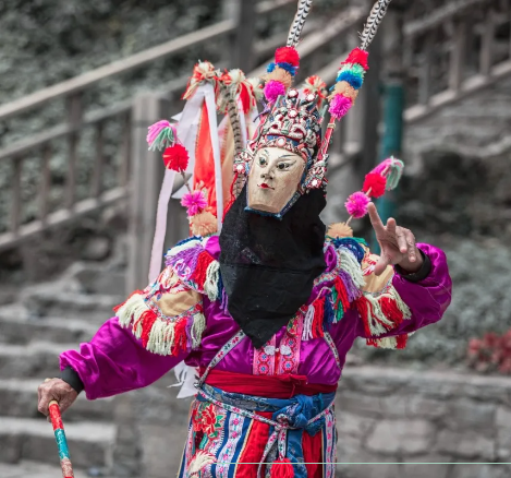 面蒙青巾,腰围战裙,戴假面于额前,手执戈矛刀戟,随口而唱,应声而舞。野蛮的唱腔、古老的戏台,栩栩如生的屯堡地戏展示着它经历过的岁月。