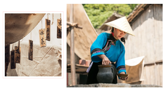 从此,传内不传外的大碗茶三种秘方,在屯堡本地人中代代相传至今。生姜、金银花、甘草、蜂蜜、本地茶叶以及秘方混合成一碗大碗茶,质朴茶香,一口下去唇齿回甘~