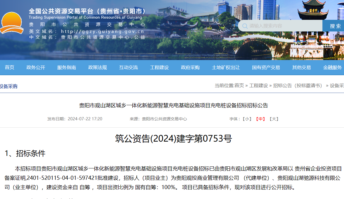 7月22日,贵阳市公共资源交易中心官网发布贵阳市观山湖区城乡一体化新能源智慧充电基础设施项目充电桩设备招标公告。