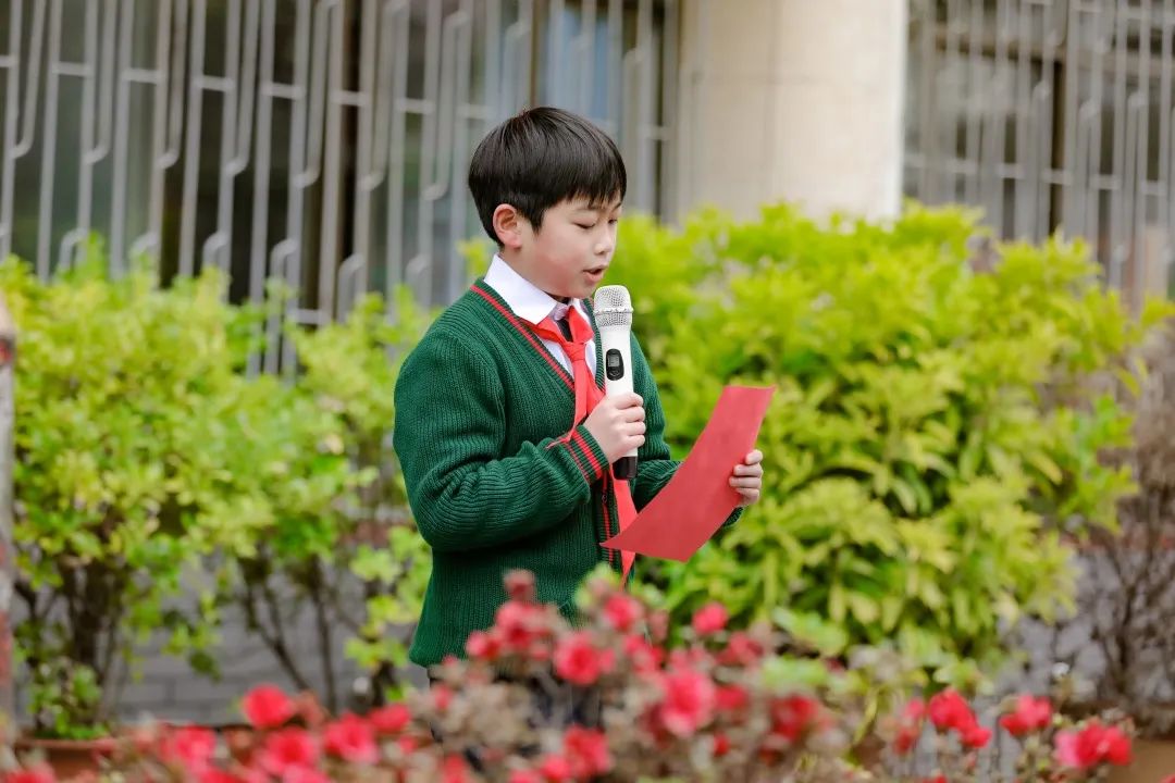 五(2)班的陈鸿阳同学作为学生代表号召大家和他一起做一个勤奋、踏实、阳光、向上的好孩子。