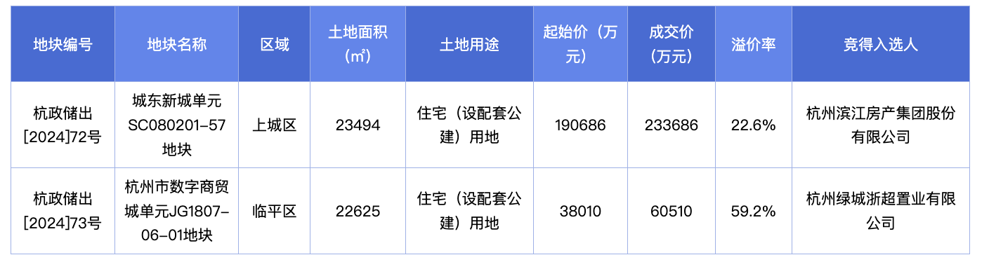 根据成交结果,该地块经过43轮竞价后由滨江集团旗下杭州滨江房产集团股份有限公司以总价23.37亿元竞得,成交楼面价35524元/平方米,溢价率22.6%。