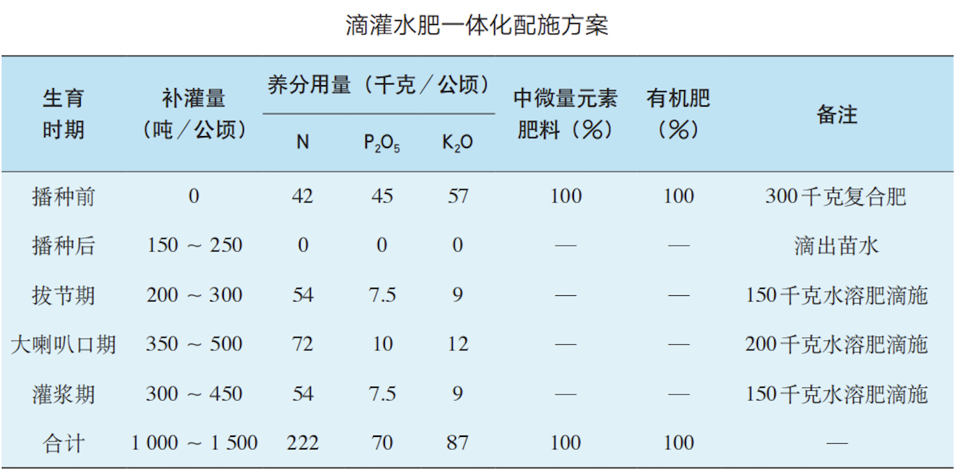在实际生产中,滴灌施肥受肥料种类、地力水平、目标产量等因素影响,需要因地制宜。下表为滴灌水肥一体化配施方案。