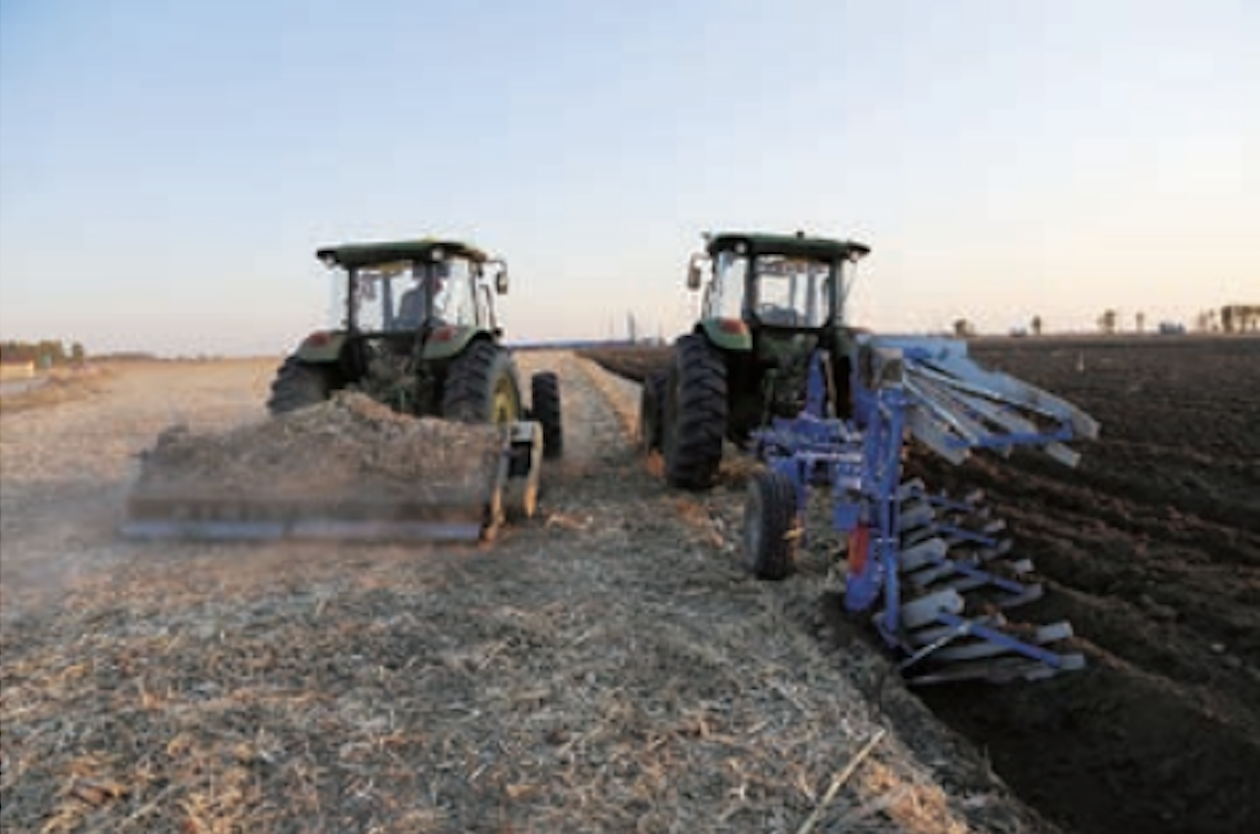 采用栅栏式液压翻转犁(配套拖拉机>140马力)进行深翻作业,翻耕深度25~35厘米,将秸秆翻埋至20厘米土层以下。