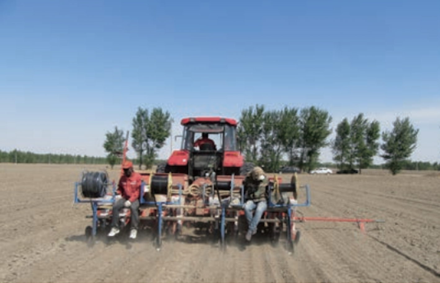 根据水源位置和地块形状设计田间管道,铺设干管长度≤500米、支管长度70~90米、支管间距100~120米、滴灌管(带)长度50~60米。采用浅埋滴灌生产方式,宽窄行大垄双行平播,一次性完成施底肥、播种、铺管、覆土作业,将滴灌带铺在窄行内,滴灌带上覆土2~4厘米。