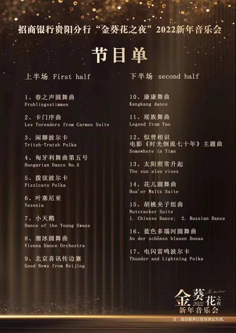 2021年12月25日(周六)20:00,香港亚洲爱乐乐团携手招商银行贵阳分行联合打造“2022金葵花之夜”新年音乐会,共同为观众带来高品质、高水准的音乐作品,邀请大家一同走进贵州省国际会议中心,感受高雅,聆听经典,近距离感受音乐的魅力。