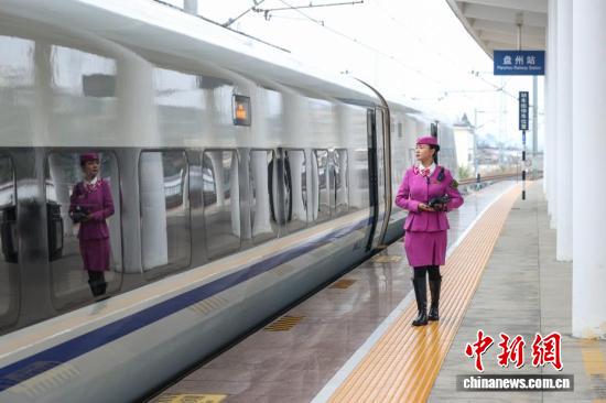贵州省盘州市,贵阳客运段乘务员在盘州站月台巡视