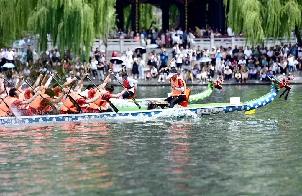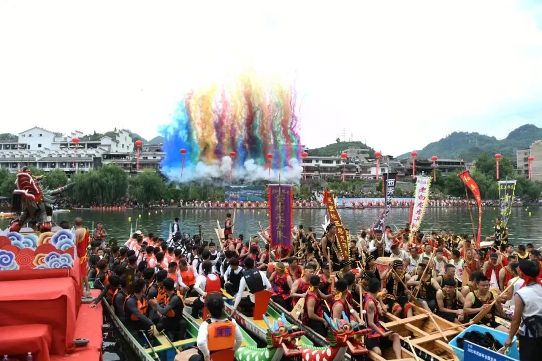 㵲阳河两岸百人唢呐齐鸣、千人战鼓齐奏、万人齐唱《爱我中华》,共同将现场氛围推向高潮。会徽、龙头船、特色主题船游江而来,展演传统龙舟文化和民间民俗风情,揪龙头、倒立蹬及传统龙舟号子等传统龙舟戏的精彩表演引人注目,活动现场精彩纷呈,目不暇接。