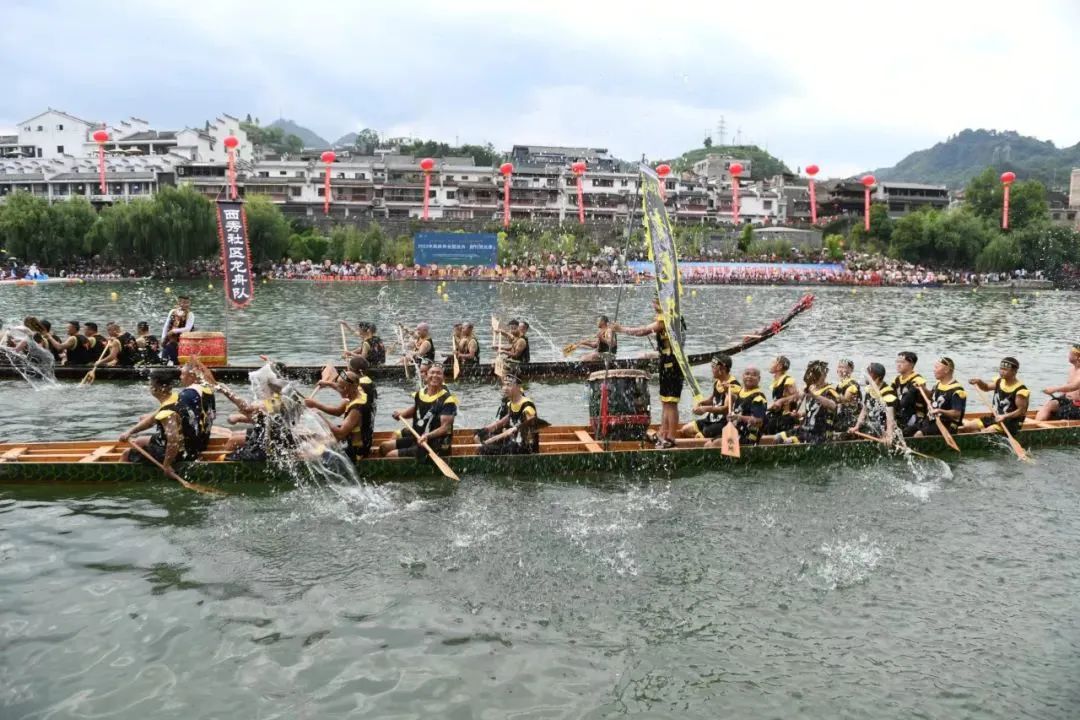 开幕式结束后,来自全国各地的11支龙舟队和7支独竹漂代表队,共353名运动员,同场竞技,踏浪飞奔,在蓝天白云的映衬之下,甚为壮观!桨手们合着鼓点奋力划桨,几十张桨片如大鹏之翼张扬闭合,水面上溅起一阵阵雪白的浪花。一条条龙舟如离弦之箭,速度与激情、力量与拼搏在㵲阳河面上相互交融;两岸呼声雷动,呐喊助威,动人心魄;大家共同传承和弘扬中华民族传统文化,凝聚新时代民族团结的拼搏精神。