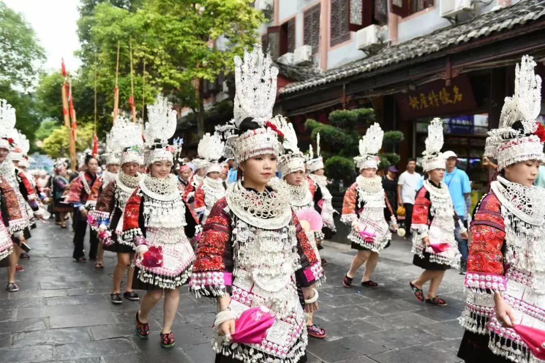 上午8时,镇远古城区人头攒动、热闹非凡,花灯戏、“三月三”、板凳舞、踩鼓舞……具有当地文化特色的22个方阵鱼贯而至,各方阵队伍通过“山水福地·千年镇远”“商贾文化”“民族民间文化”等篇章全方位展现镇远深厚的历史文化、古商文化及绚烂的民族民间文化,特别是100名壮汉共抬3000斤大龙头游行,甚是震撼,行进中各方阵队员与现场群众互动,全民沉浸在欢乐的民俗文化盛宴中。