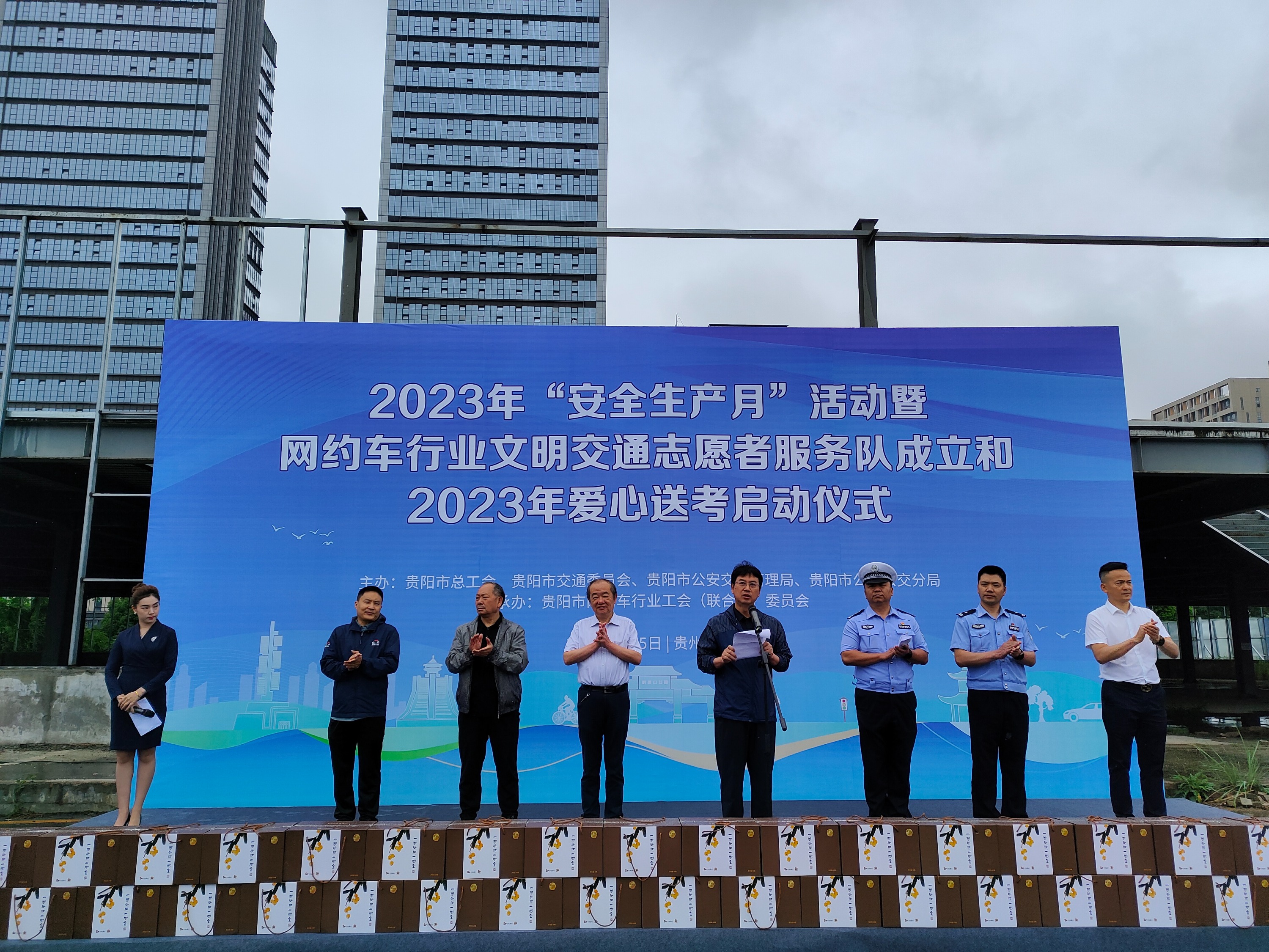 为进一步弘扬奉献、友爱、互助、进步的志愿精神, 6月5日,由贵阳市总工会、贵阳市交通委员会、贵阳市公安交通管理局、贵阳市公安公交分局、贵阳市网约车行业工会联合委员会共同举办的2023年“安全生产月”活动暨网约车行业文明交通志愿者服务队成立和2023年爱心送考仪式在贵阳北站举行。