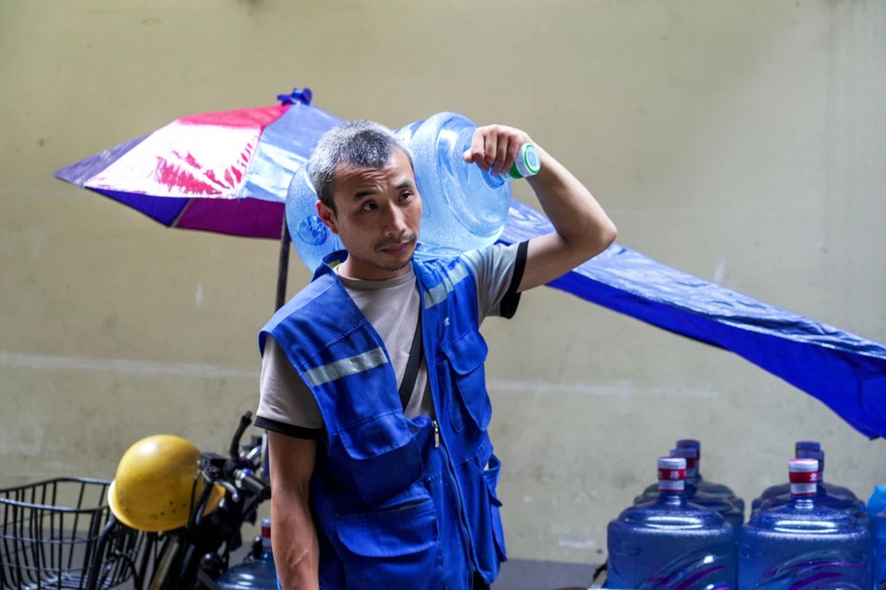 “干我们这行,简单说就是扛着水桶爬楼梯。一天少说也得送个七八十桶吧。夏天是最累的,背上衣服就没干过,汗流浃背是常态。” 虽然辛苦,但他语气里没有抱怨,反而有种习以为常的坦然。跟随邹师傅来到一个没有电梯的老旧小区。他扛着沉甸甸的水桶,一步步爬上六楼,楼道里闷热难耐,空气仿佛凝固了。邹师傅每一步都显得沉重,喘息声清晰可闻。但他没有停歇,稳稳地托着水桶,目标明确——将那份急需的清凉,准时送达。