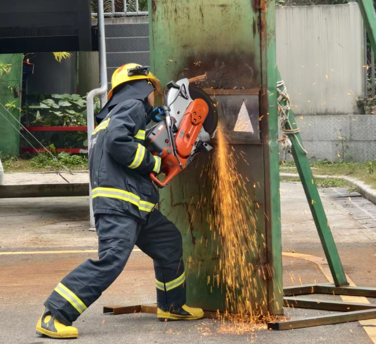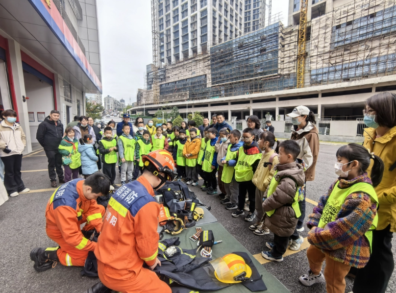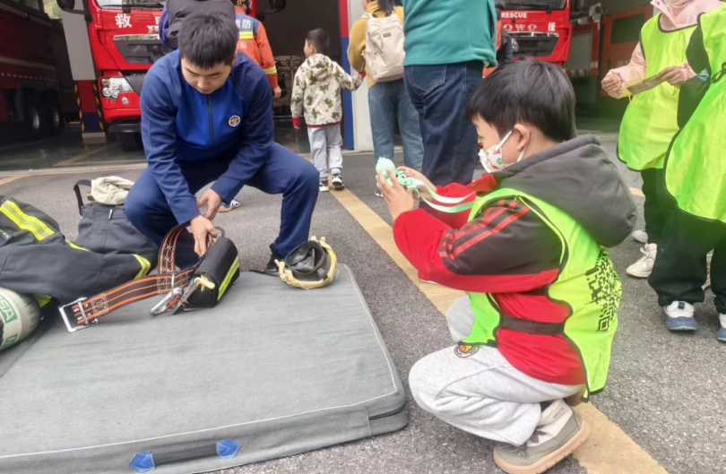 在装备展示区,消防员向小记者们介绍了消防战斗服、空气呼吸器、破拆工具组等专业设备的功能与使用场景。孩子们踊跃试穿消防头盔和防护服,亲手触摸厚重的装备材质,近距离观察消防车,切身感受消防员在执行任务时所承担的“重量”与责任。