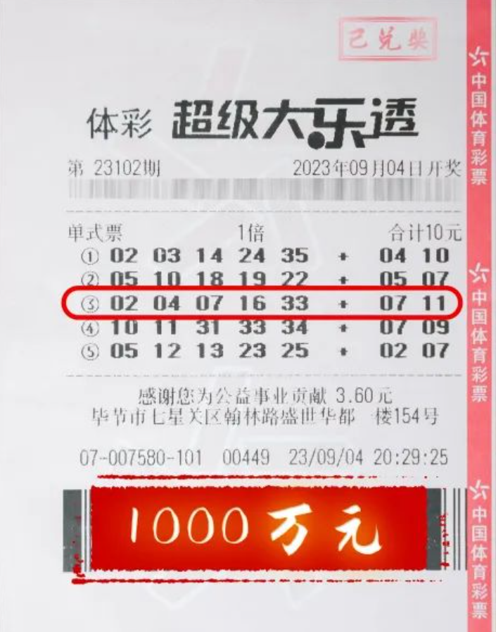 9月4日,体彩超级大乐透第23102期前区开出号码“02、04、07、16、33 ”,后区开出号码“07、11”。本期全国共开出2注基本投注一等奖,单注奖金1000万元,分落福建厦门、贵州毕节。毕节的1000万元,出自毕节市七星关区5207007580门店。