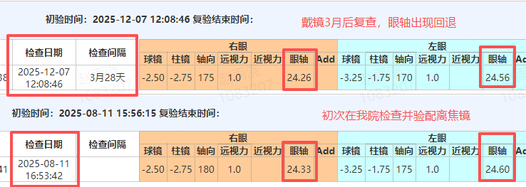 2025年12月,小明返院复查。结果显示,其右眼眼轴回退至24.26mm,左眼回退至24.56mm,分别减少了0.07mm和0.04mm。这一以毫米计的变化具有重要意义,不仅是近视进展得到有效控制的积极信号,也再次印证了科学干预的必要性。