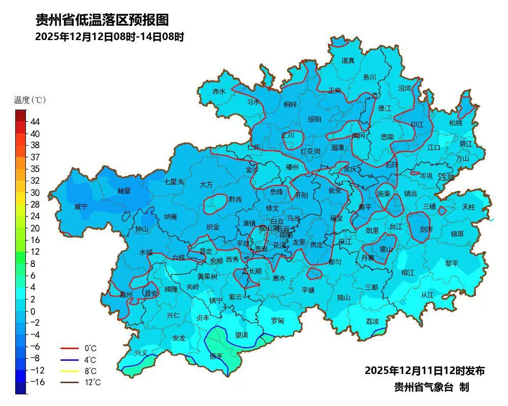12日夜间,全省阴天有小雨,西北部高海拔地区有冻雨或雨夹雪,中部一线地势高处有4-6级偏北大风;13日,全省零星小雨转多云到晴,省的中北部大部分地区夜间到早晨有霜或雾;