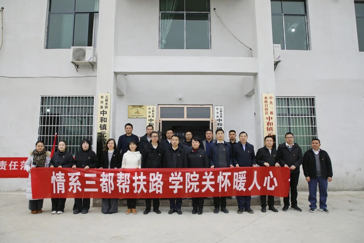 12月29日,学院新一届党委领导班子刘林锐、邓川等一行10人,赴乡村振兴帮扶村——三都水族自治县中和镇元幹村开展工作调研,看望慰问驻村干部,并与中和镇元幹村党总支联合开展主题党日活动。驻村帮扶调研座谈会在元幹村会议室召开,三都水族自治县残联、中和镇、凤羽街道相关负责人,元幹村、甲化村党总支书记及学院驻村干部罗支友、卿钊、赵彪等参加会议,中和镇党委书记张文杰主持会议。