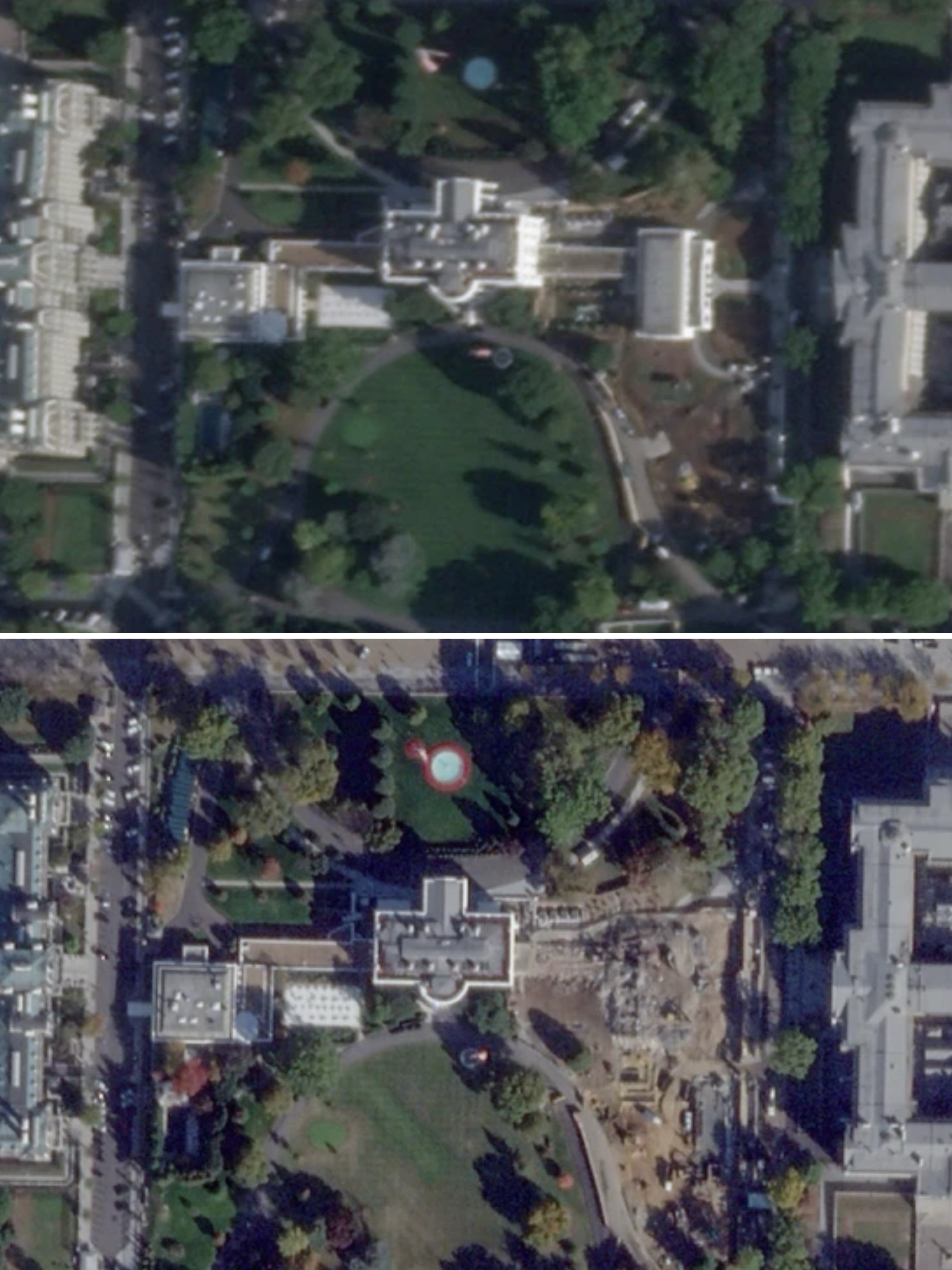 美国白宫9月26日(上)与10月23日(下)的卫星照片对比。