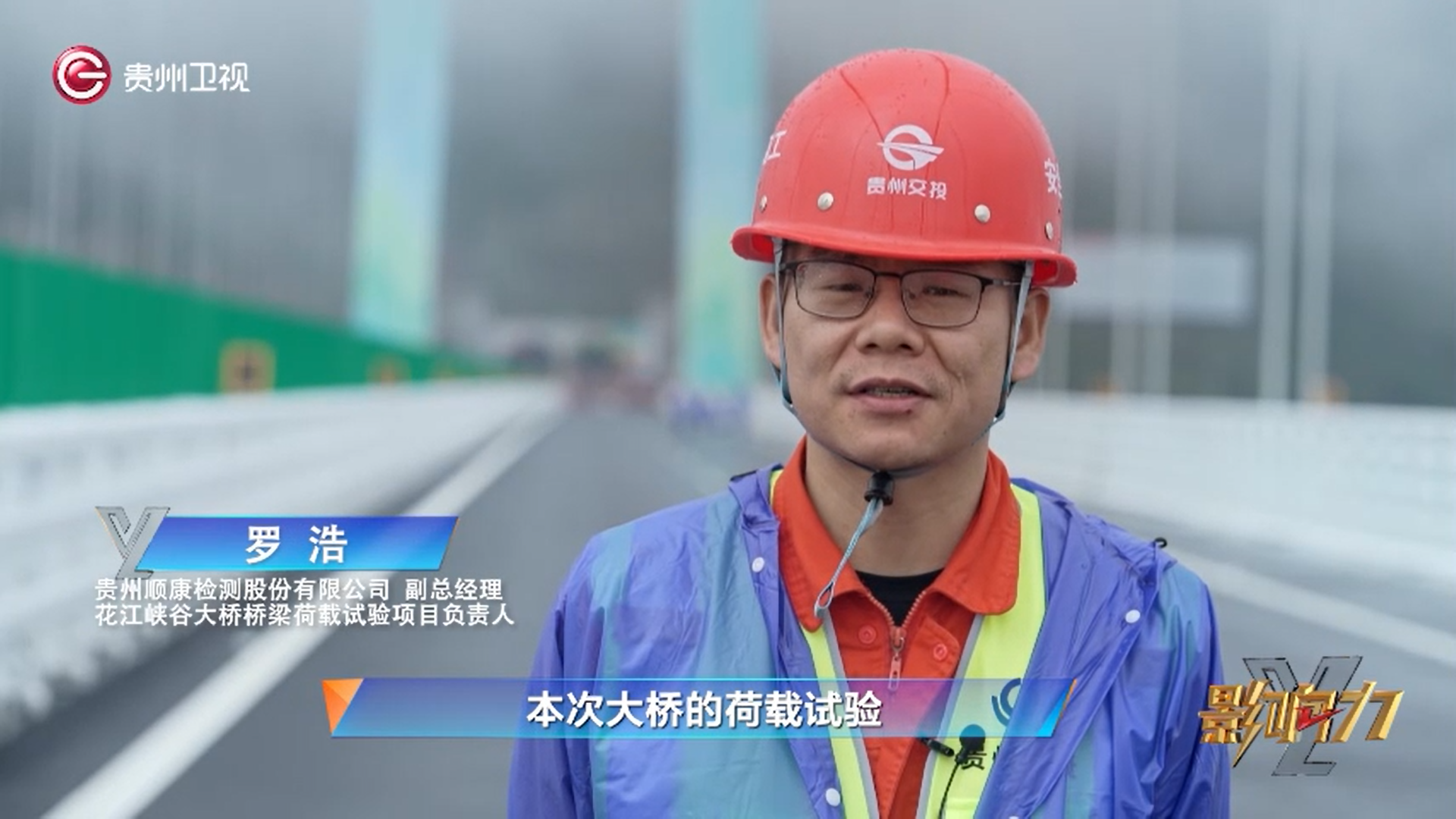 罗 浩 贵州顺康检测股份有限公司副总经理 花江峡谷大桥桥梁荷载试验项目负责人:本次大桥的荷载实验具体就是以等重量的加载车,模拟我们平时运营过程中的车辆荷载进行一个实验,来提取我们桥梁结构的反应,测试它主要关键截面的一些应变、位移等等指标,该项工作是我们通车前的最后一道检验工作,荷载试验工作做完了以后,剩下的一些附属工程实施完成,然后具备通车条件,通过交工验收即可通车运营。