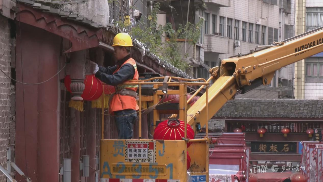 在黔南布依族苗族自治州都匀市,市政工作人员穿梭在各个街道挂灯笼、摆放花卉。