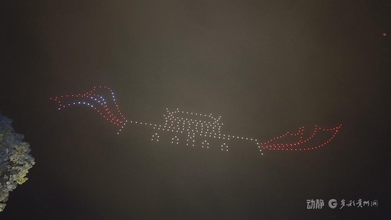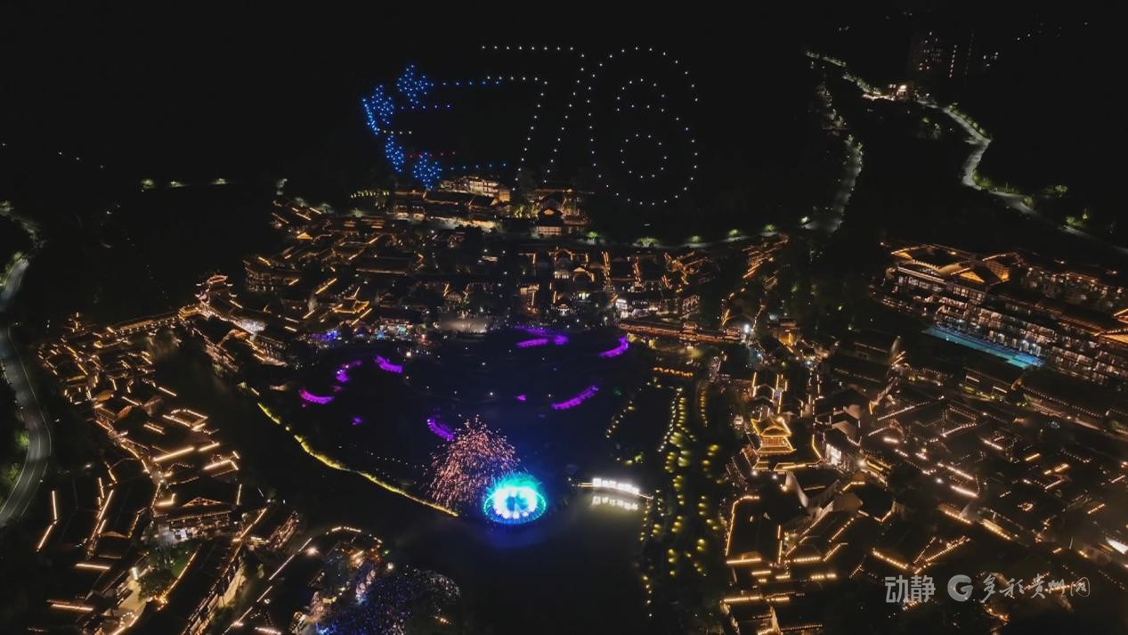位于遵义市播州区的乌江寨景区,众人手持国旗,合唱《我和我的祖国》,以歌声向祖国表白。夜幕降临,无人机编队变换出天安门、中国结等图案,金色烟火如星雨洒落,游客放飞写满祝福的孔明灯,点点灯火映照夜空,传递出大家的美好祝愿。