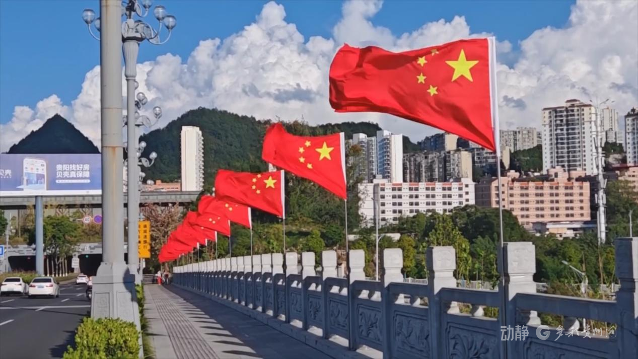 在贵阳市、遵义市,大街小巷喜气洋洋,主要街道两旁整齐悬挂起鲜艳的五星红旗,一抹抹中国红成为街头最亮眼的风景,也点燃人们心中炽热的爱国情怀。