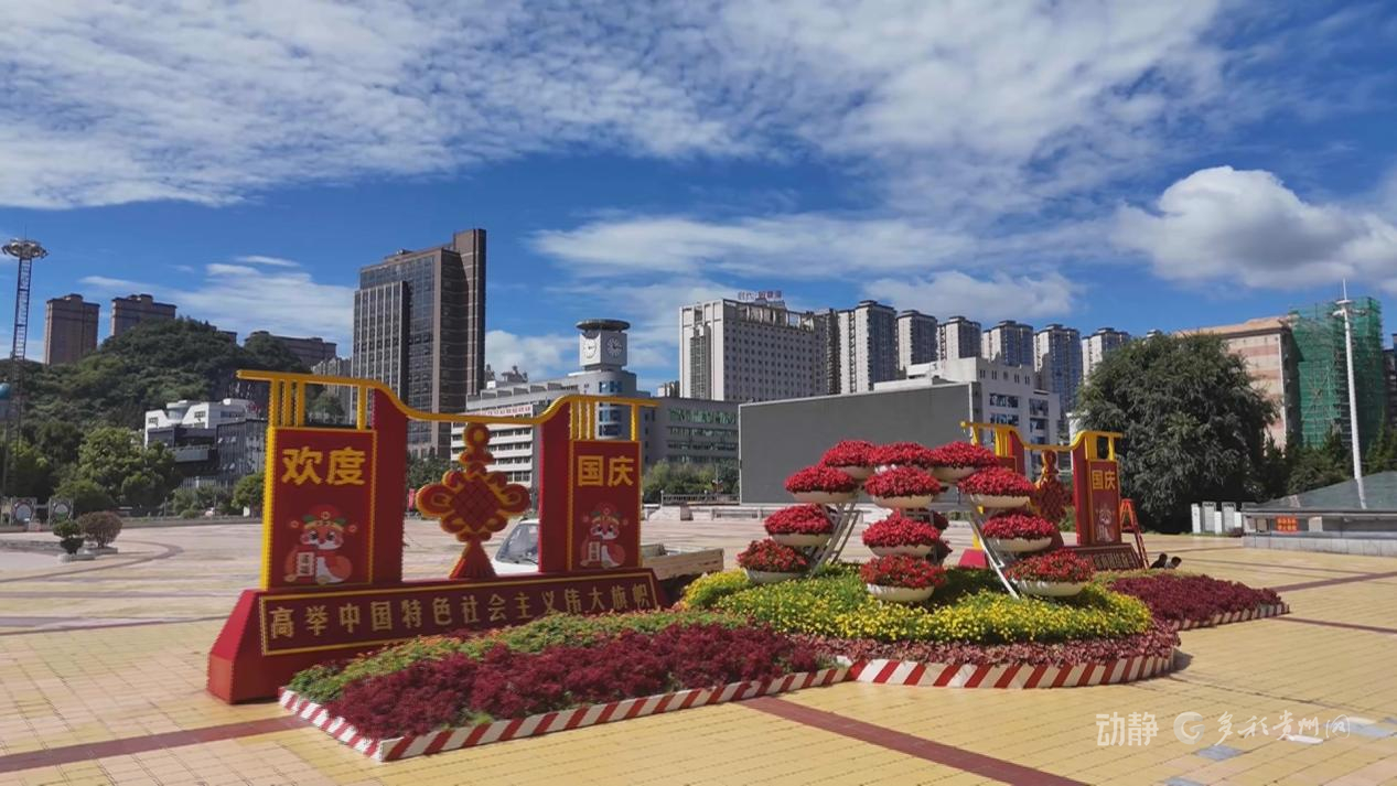 国庆中秋双节将至,贵州各地通过悬挂国旗、布景花卉等方式将城市装扮一新,营造喜庆氛围,迎接佳节到来。