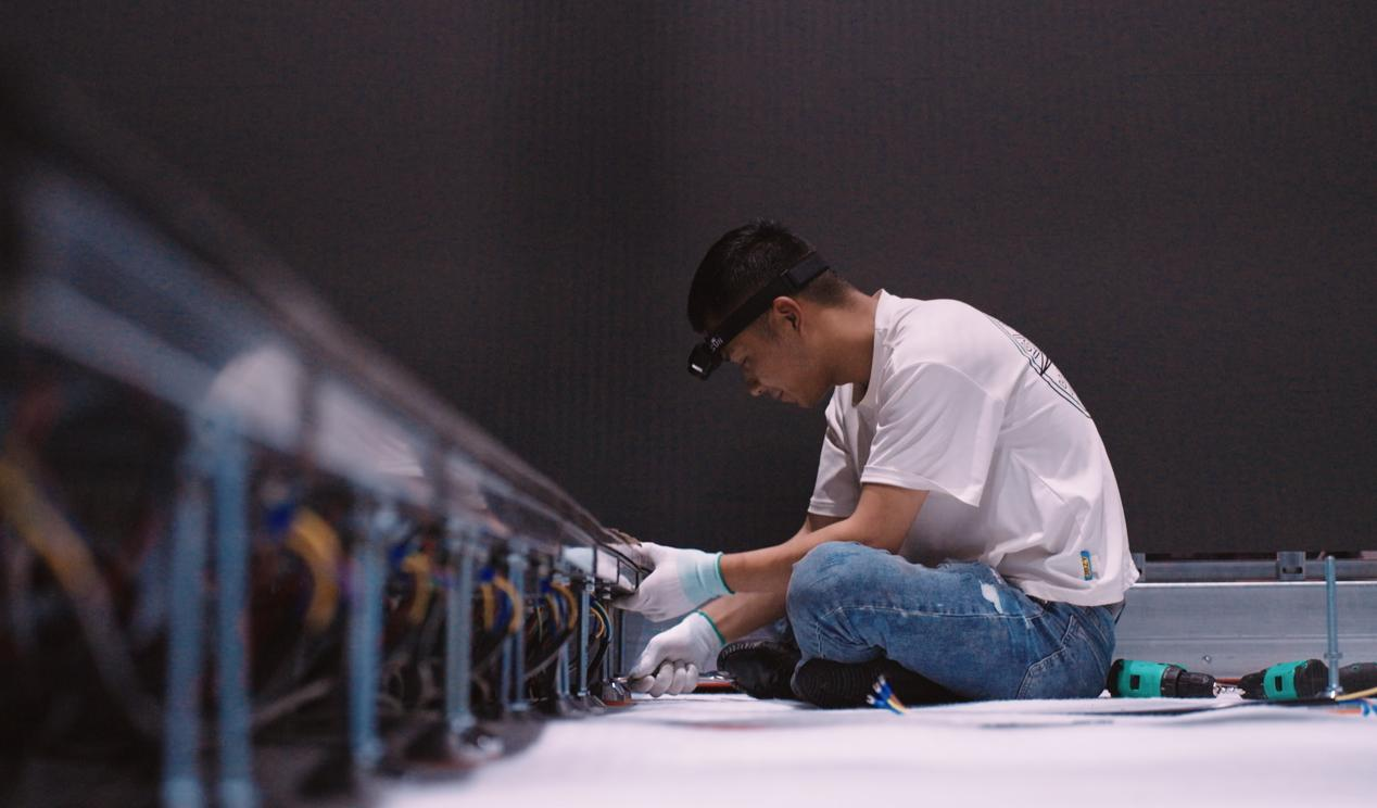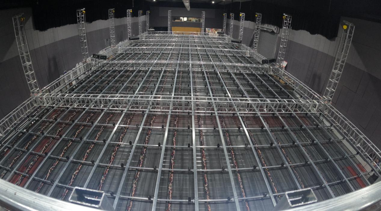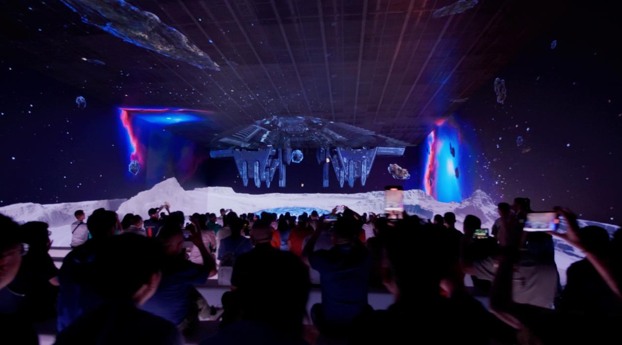 演艺现场是目前国内最大的五折屏幕的观影场地,采用P1.8的超高清LED屏幕,内部净高6米,净宽15米,纵深36米,近3240立方的演出空间,实现了分辨率为24K的超高清画面呈现。