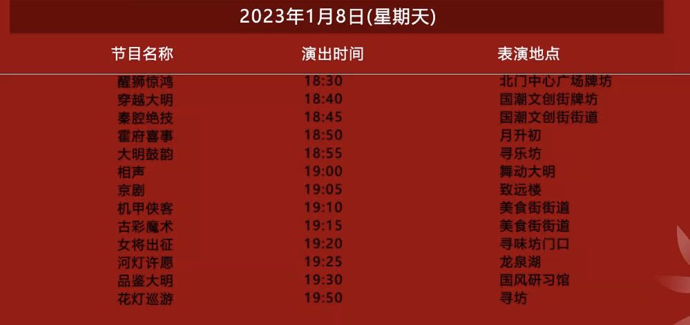 1月8日 18:00-19:00 将在北门中心广场举行开街仪式!期间有穿越大明、秦腔绝技、古彩魔术、花灯巡游等精彩纷呈的演出,演出会持续到20:00结束,我们与您不见不散!