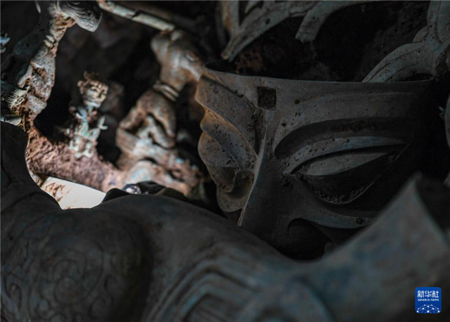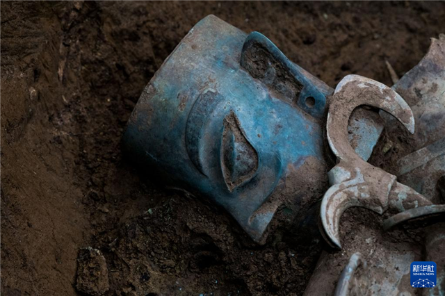 这是在三星堆遗址8号“祭祀坑”拍摄的铜面具。