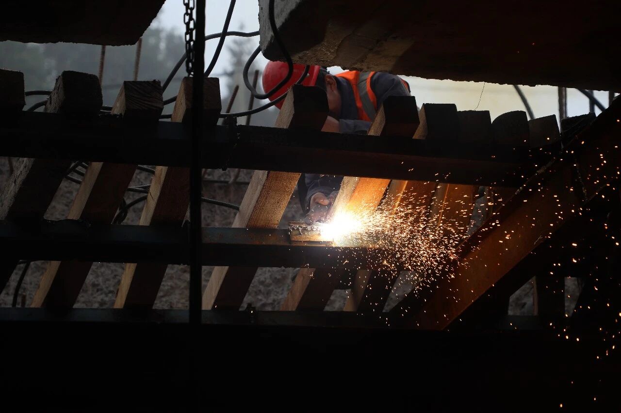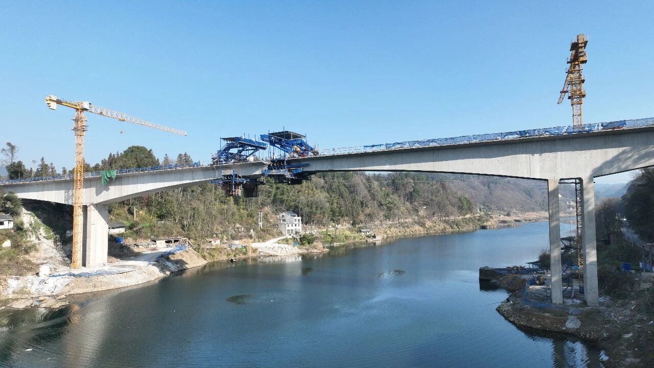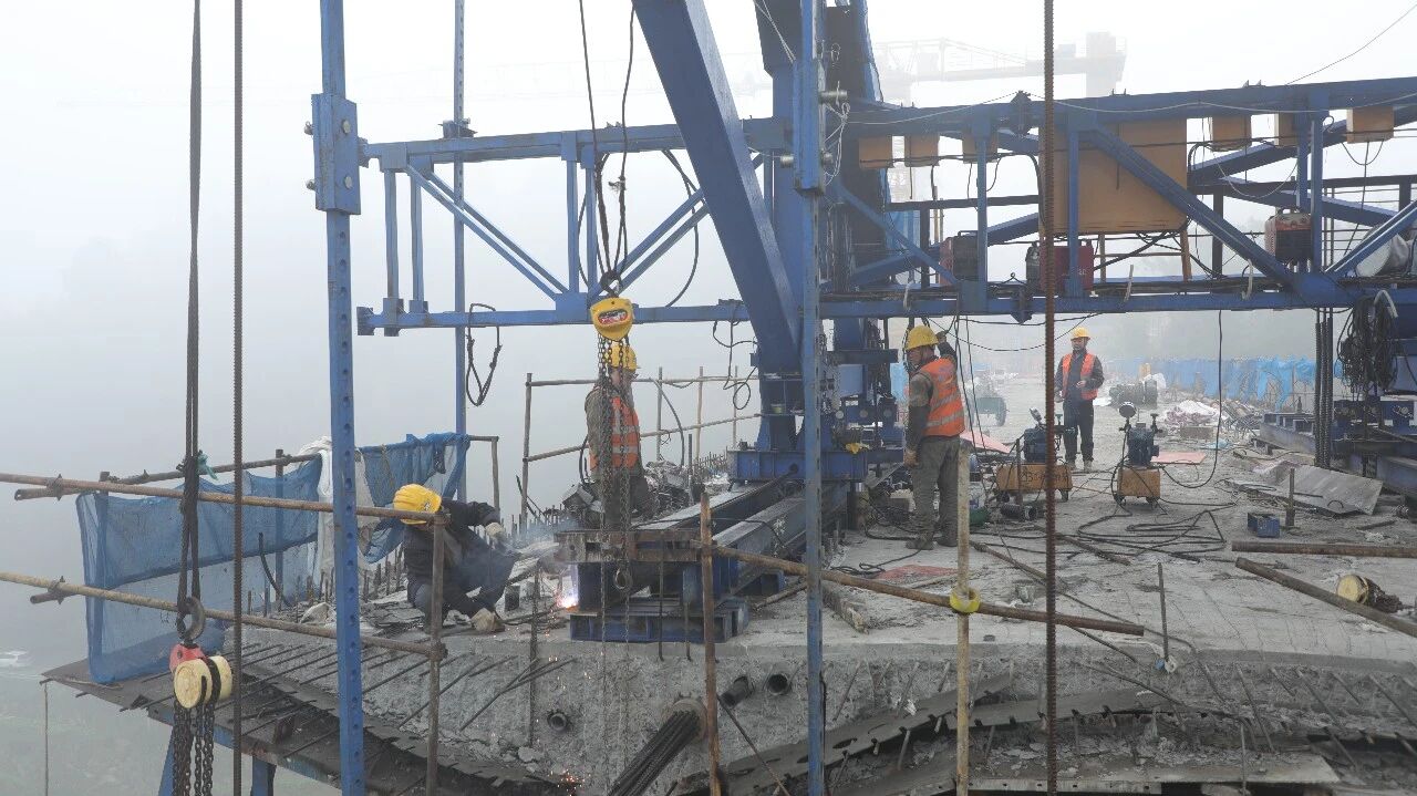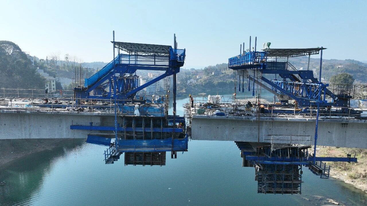 施工现场,两台挂篮设备同步运转,向着大桥中跨合龙点位稳步推进。两岸塔吊高耸林立,工程车辆往来穿梭,机械轰鸣声此起彼伏;建设者们各司其职、有条不紊开展挂篮顶推、钢筋绑扎、模板安装等施工作业,处处涌动着大干快上的建设热潮。