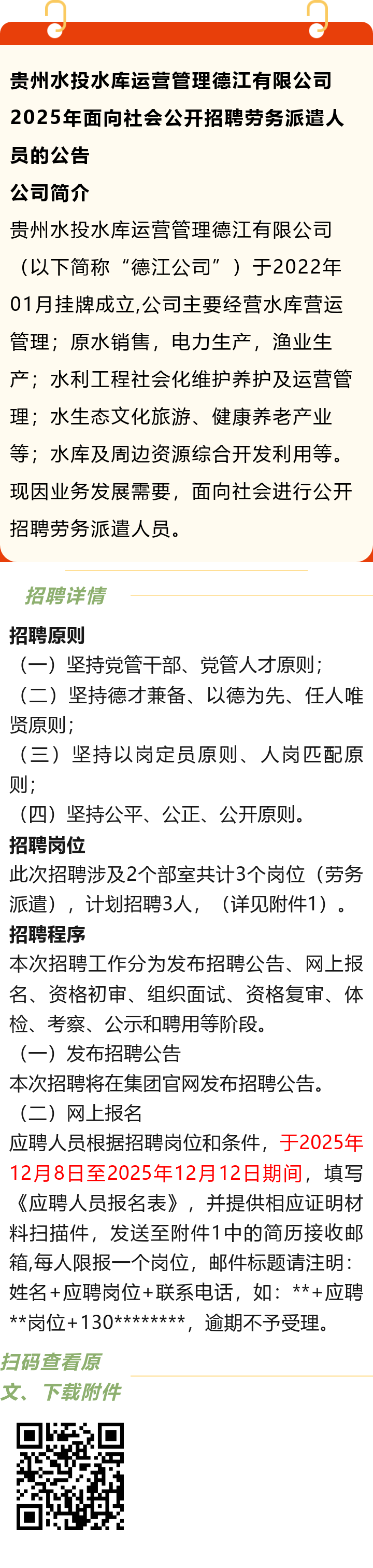 【国企】贵州水利投资集团旗下企业招聘!报名截止时间:2025年12月12日!