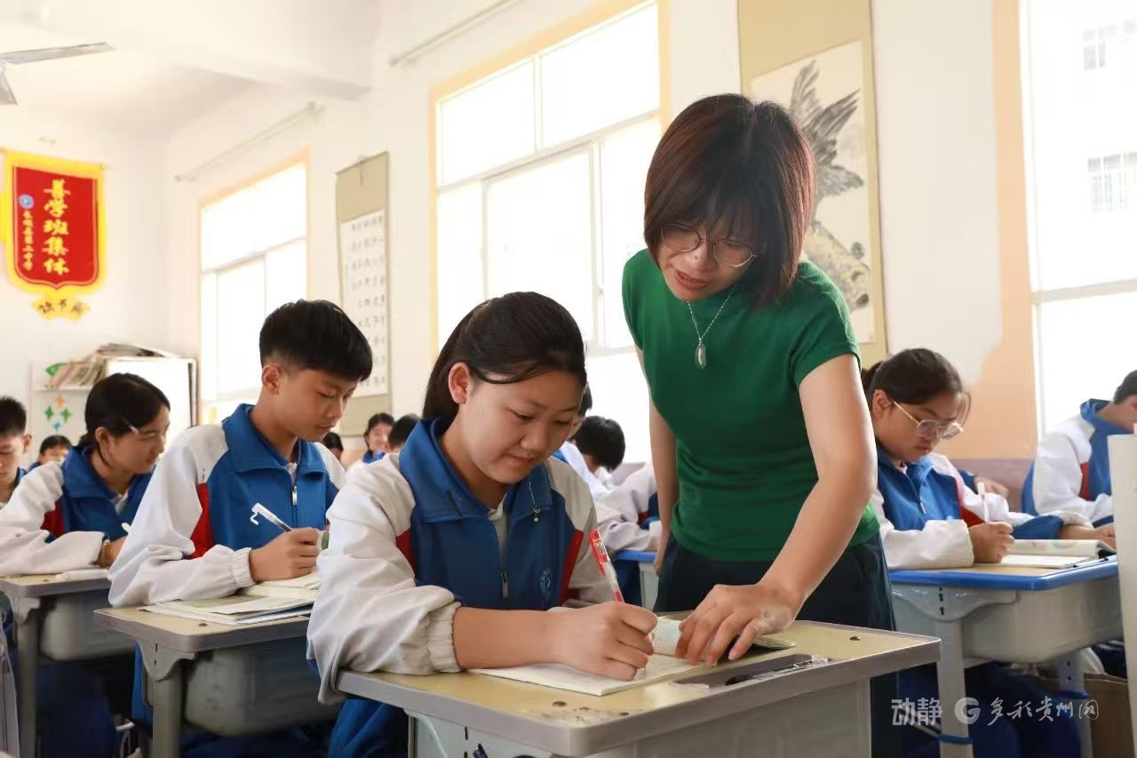 图为教师刘锐正在给学生辅导:刘锐是广州市黄埔区玉泉学校地理教师,是广州市骨干班主任,因曾在三都县水族自治县中和中学上过一堂《做最好的自己》主题班会课,对贵州教育环境印象颇深,遂带着对教育帮扶工作的坚定信念和那份跨越千山万水的深厚情谊,主动请缨到长顺支教。