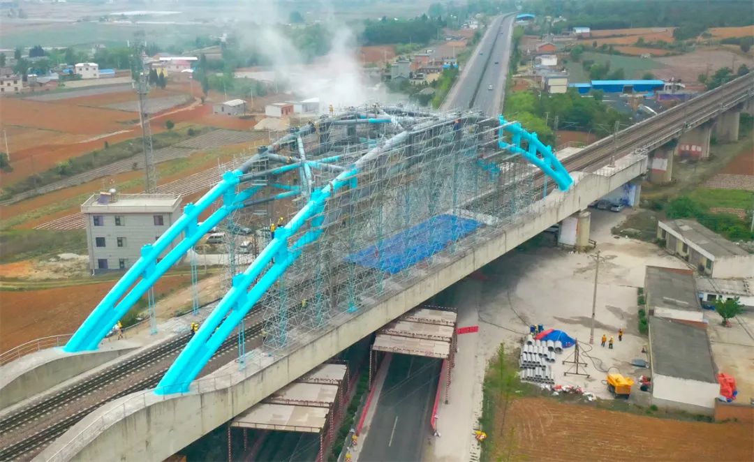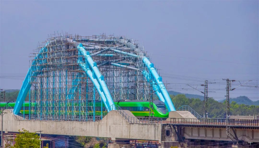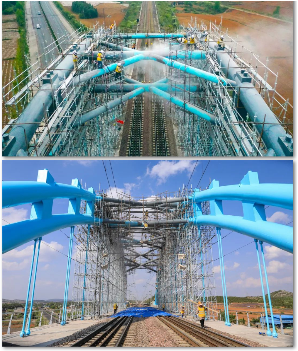 截至4月30日,沪昆线上跨宣天公路立交桥喷砂、除锈、涂装作业已全部完成,经技术部门验收达标。脚手架拆除工作正在有序进行,“彩虹桥”即将以崭新面貌迎送列车。
