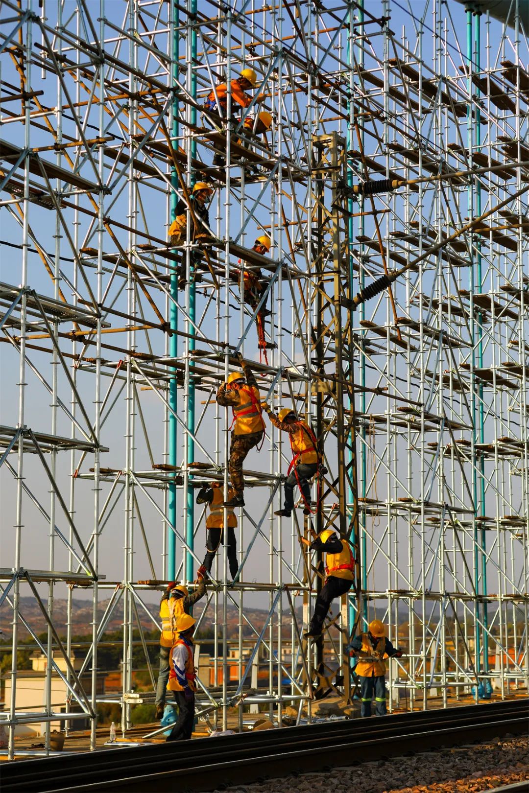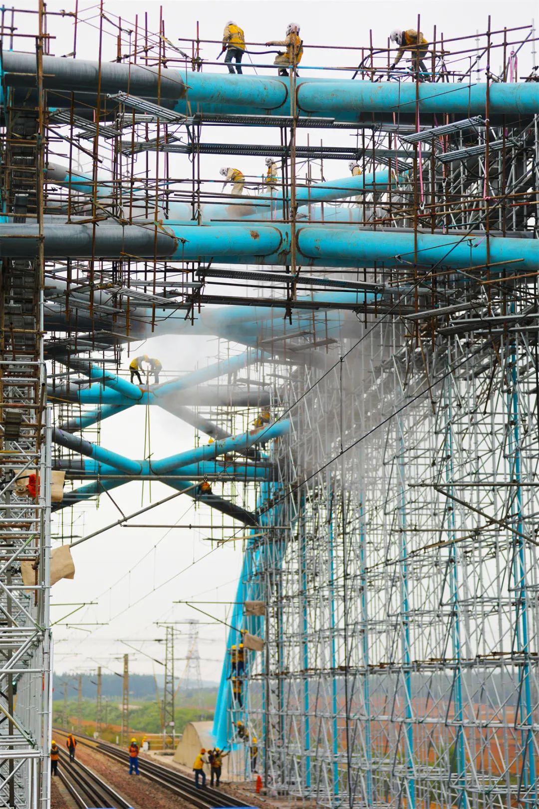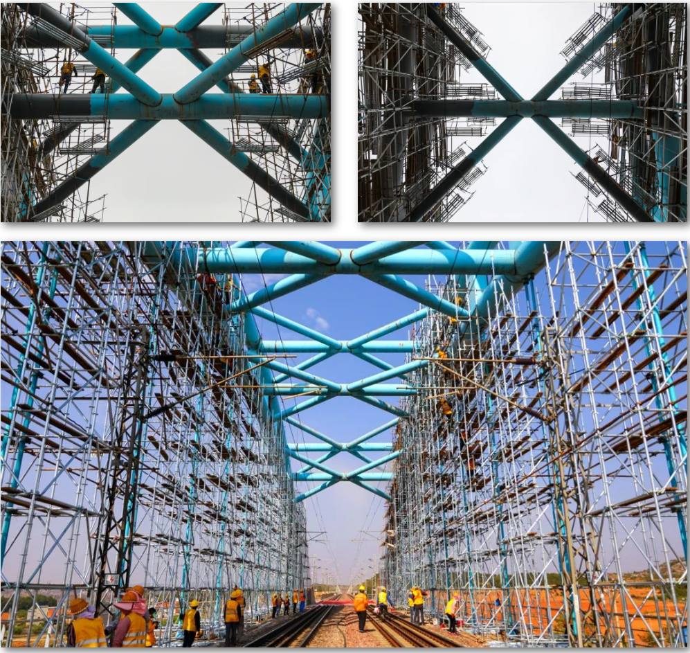 “区间已封锁、接触网已停电。”15时10分,随着“天窗”命令下达,施工人员穿好安全绳、戴上头盔,手脚并用迅速爬上脚手架,穿行在杆拱、米字型横撑等构件之间,喷砂、除锈、打磨、上漆,一道工序接着一道工序推进。
