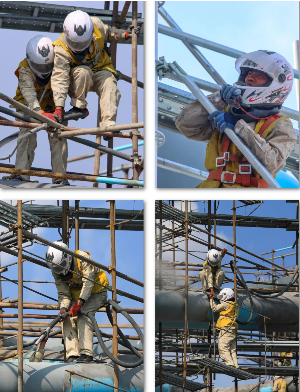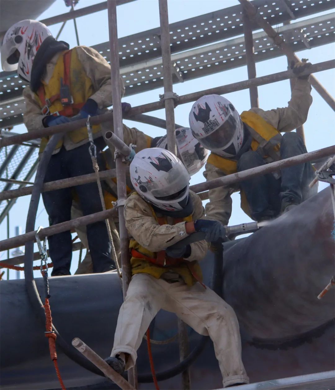 为保证迎着大风在40米高的桥梁顶部作业的人员安全,经过技术部门和现场负责部门反复试验,比起普通安全帽、护目镜、口罩,选用摩托车头盔对作业人员进行防护,安全系数最高。为此,车间统一购买了质量可靠的摩托车头盔,凡是上桥喷砂除锈的作业人员均需佩戴。