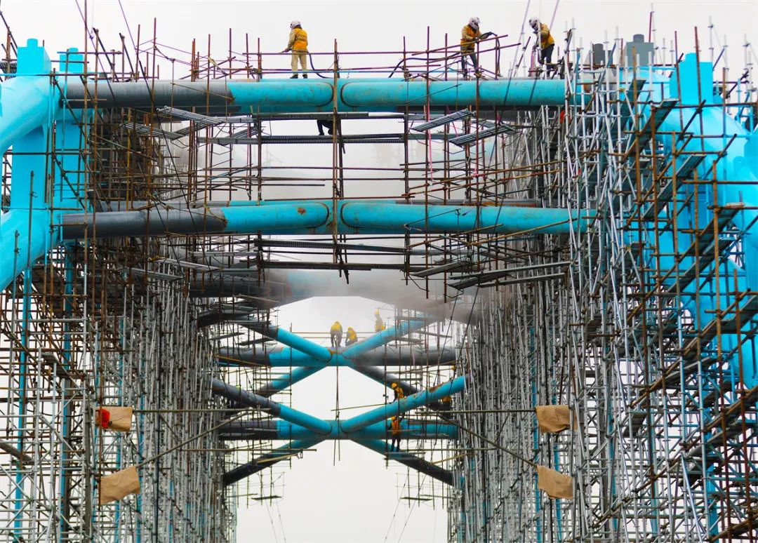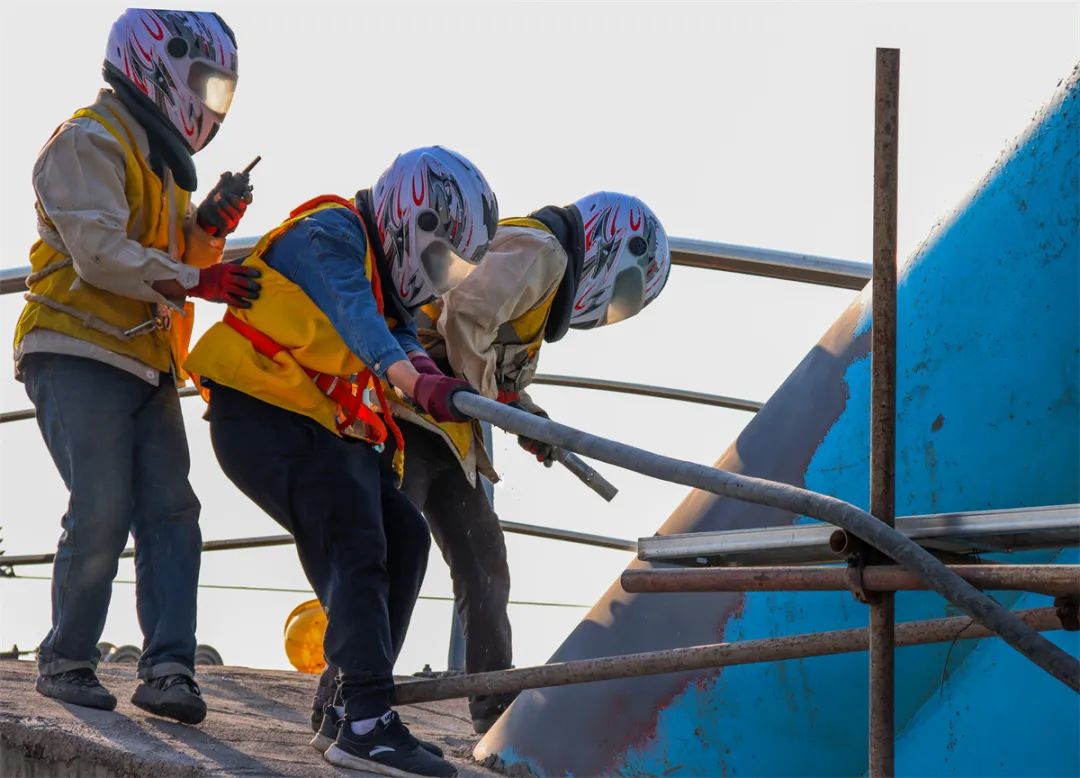为消除桥梁锈蚀潜在隐患,作业人员要对桥梁100米系杆拱桥主拱钢管、米字型横撑等部位进行喷砂除锈,并完成重新涂装。喷砂、除锈、涂装3道工序工作量共计约7800平方米。