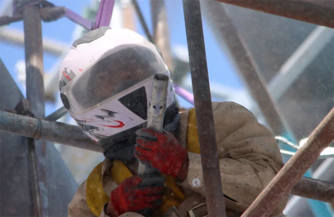 “今天的作业是对彩虹桥进行喷砂、除锈、涂装。桥上风大,大家慢走细看、踩稳抓牢。”