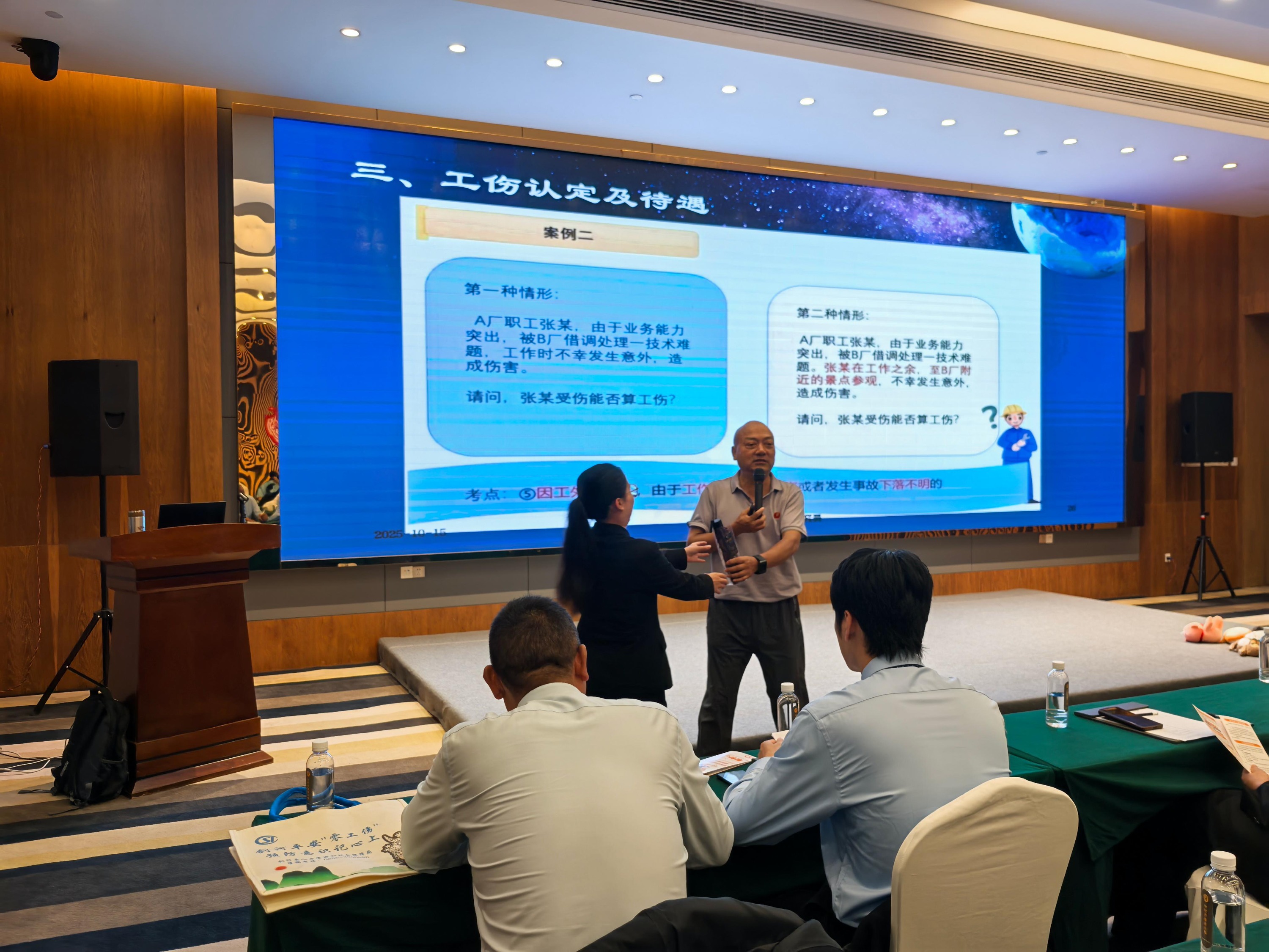 为打破传统培训 “单向灌输” 的局限,本次培训特邀贵州省工伤预防领域专家现场授课,采用 “生动化教学 + 场景化互动” 模式激活学习氛围。在榆森商业运营管理公司培训现场,授课专家谢老师以 “工伤预防就像雨伞,宁可备而不用,不可用而不备” 为生动比喻,瞬间聚焦学员注意力;为进一步调动参与积极性,老师结合真实案例抛出互动问题 ——“A 厂职工张某因业务能力突出被 B 厂借调处理技术难题,工作中不幸受伤,能否认定为工伤?”,参训员工踊跃举手作答,答对者获赠精美礼品。趣味互动中,员工不仅加深了对工伤认定政策的理解,更实现了政策知识 “学懂、弄通、会用” 的目标。