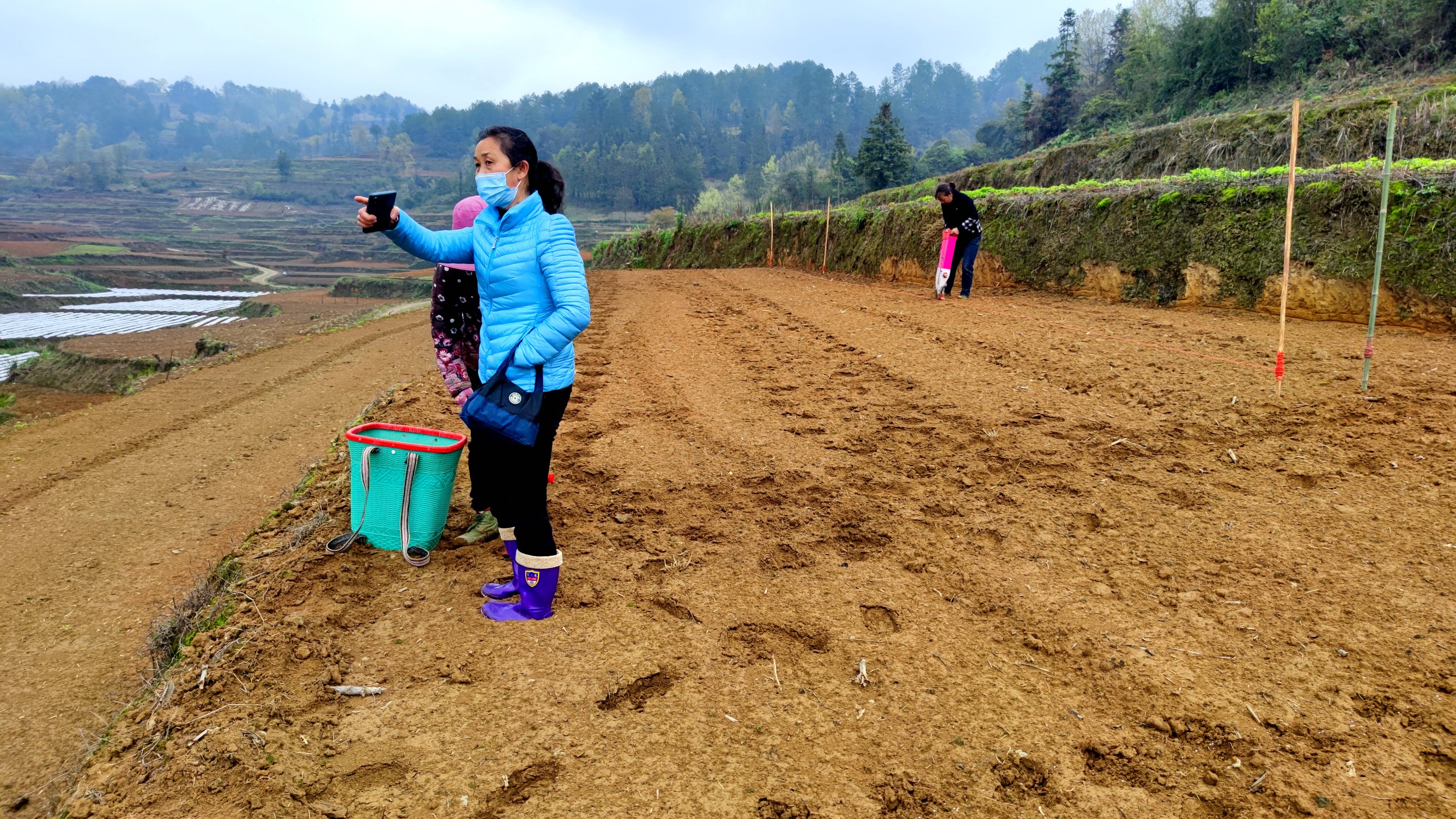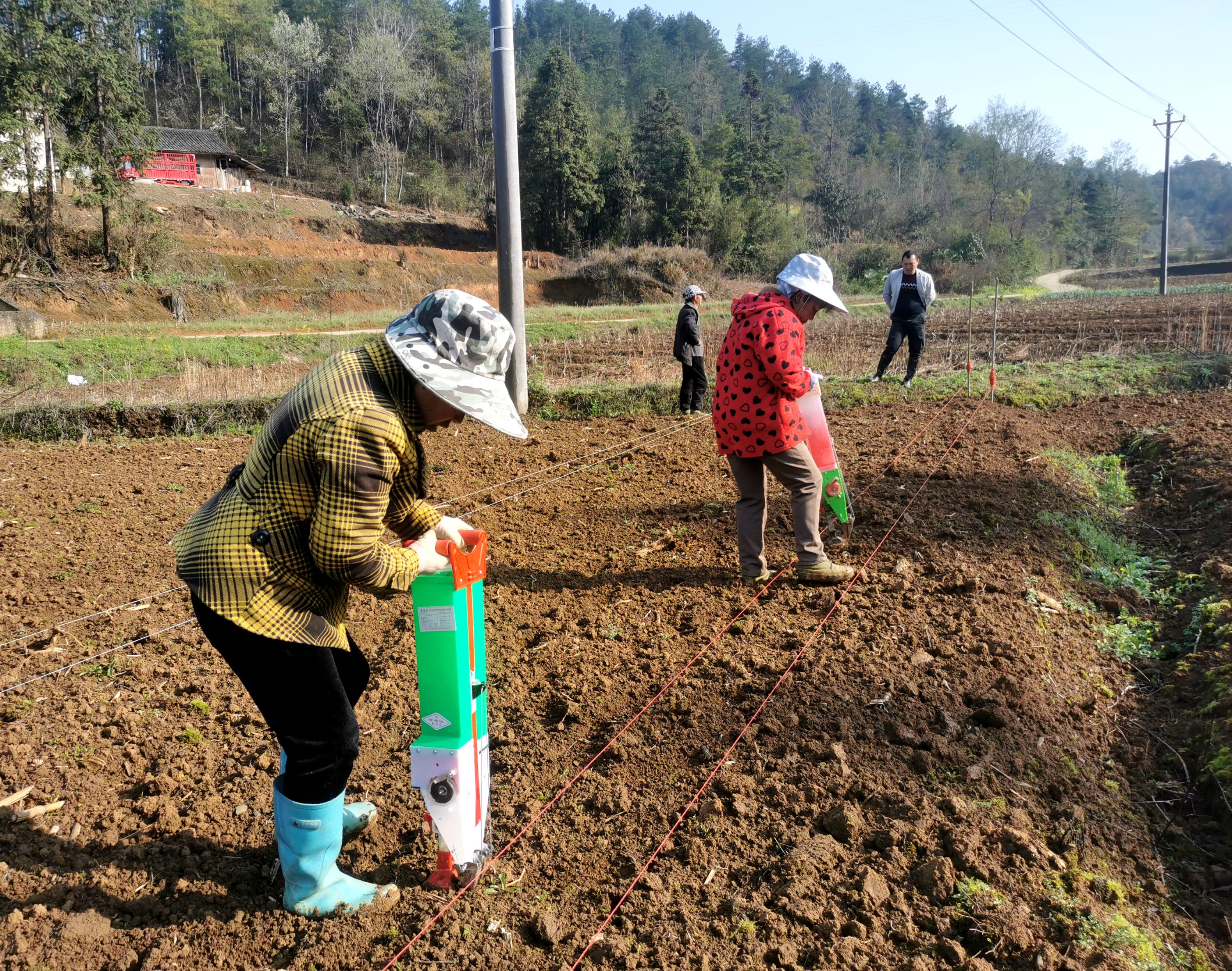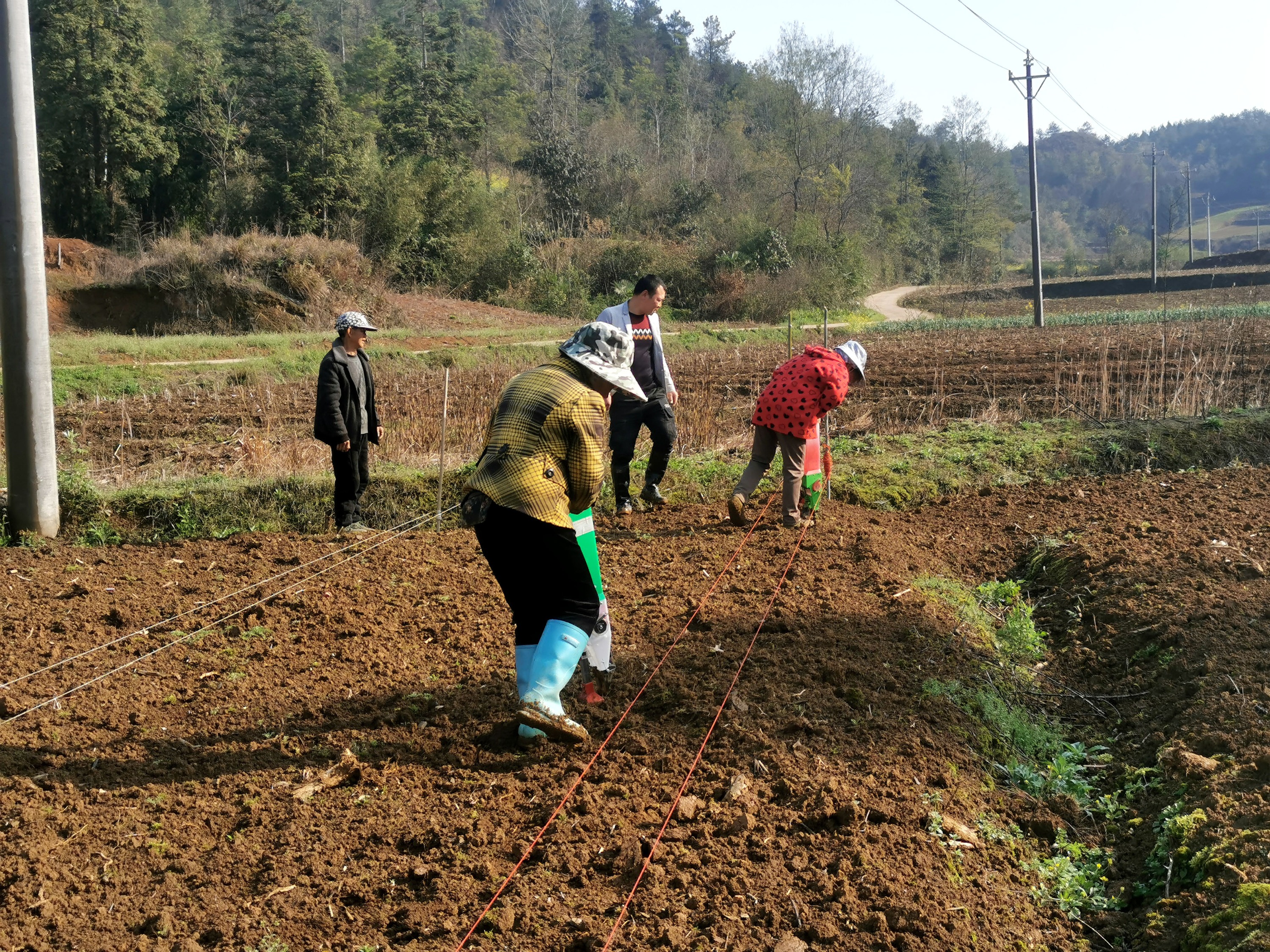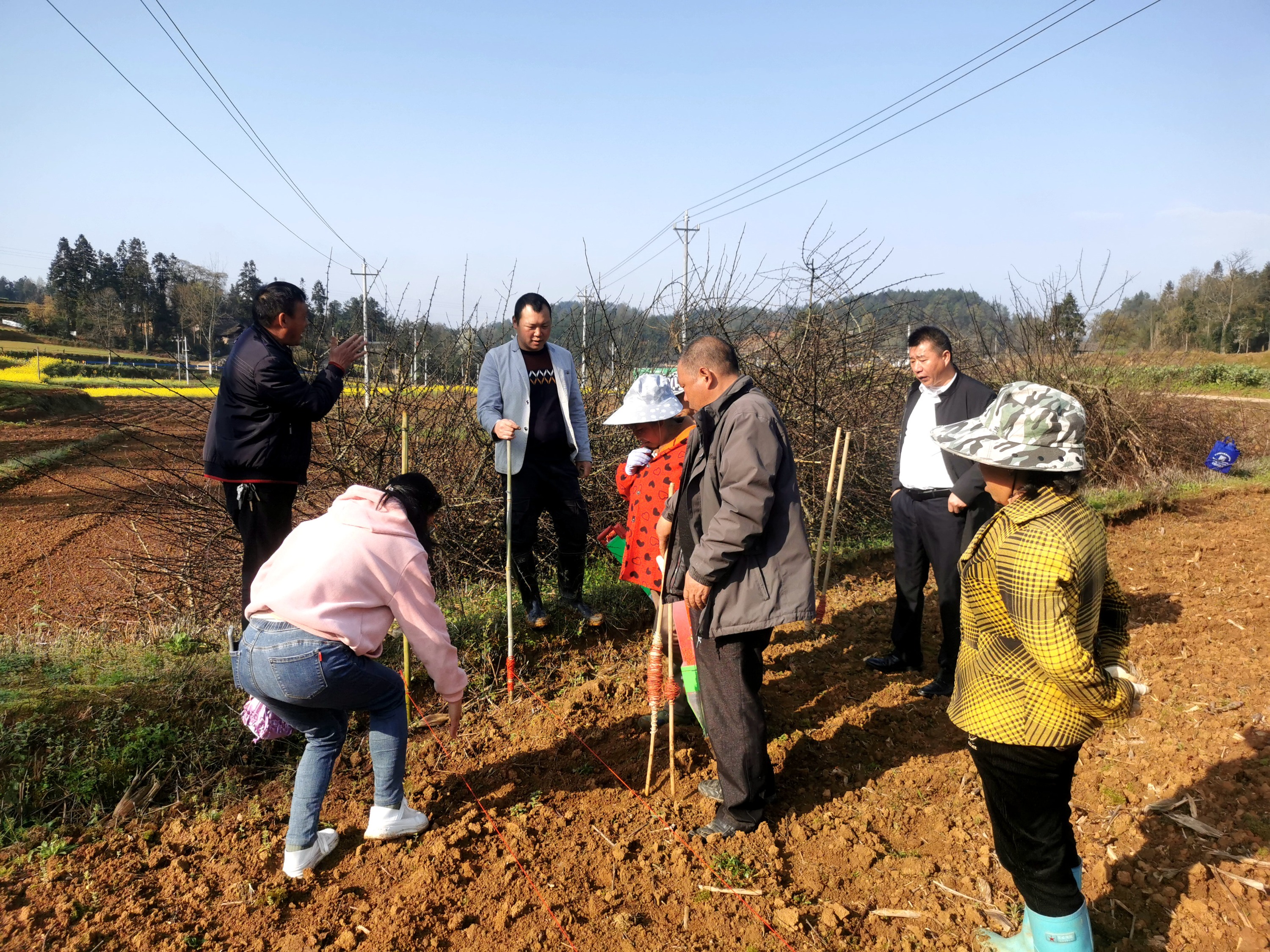 3月30日,春季温暖和煦的阳光映射在牛大场镇吴家塘村大豆玉米带状复合种植基地,该镇农业服务中心工作人员们手拿皮尺锄头,正在向群众亲身示范种植技巧——