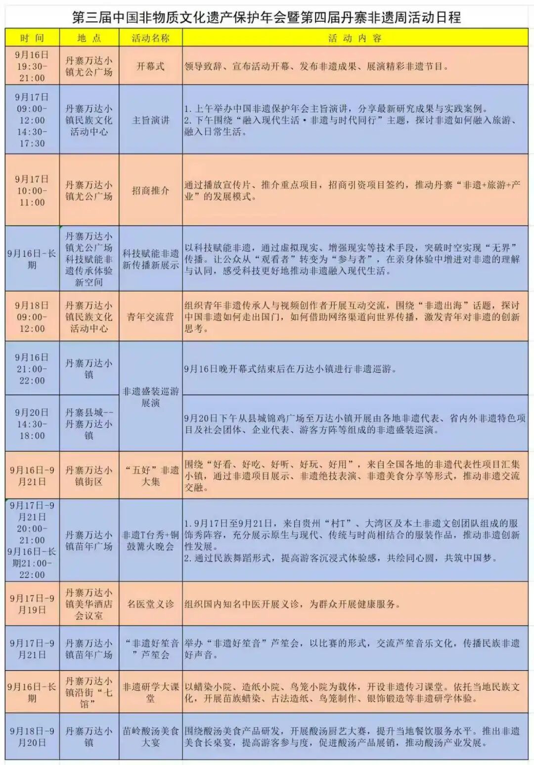 备受瞩目的第三届中国非物质文化遗产保护年会暨第四届丹寨非遗周即将于9月16日在丹寨万达小镇盛大开幕!如何高效打卡精彩活动?如何深度体验丹寨魅力?又如何顺路玩转整个黔东南州?别急,这篇推文将为您一一揭秘,从活动日程到吃住行游,一站式全搞定!