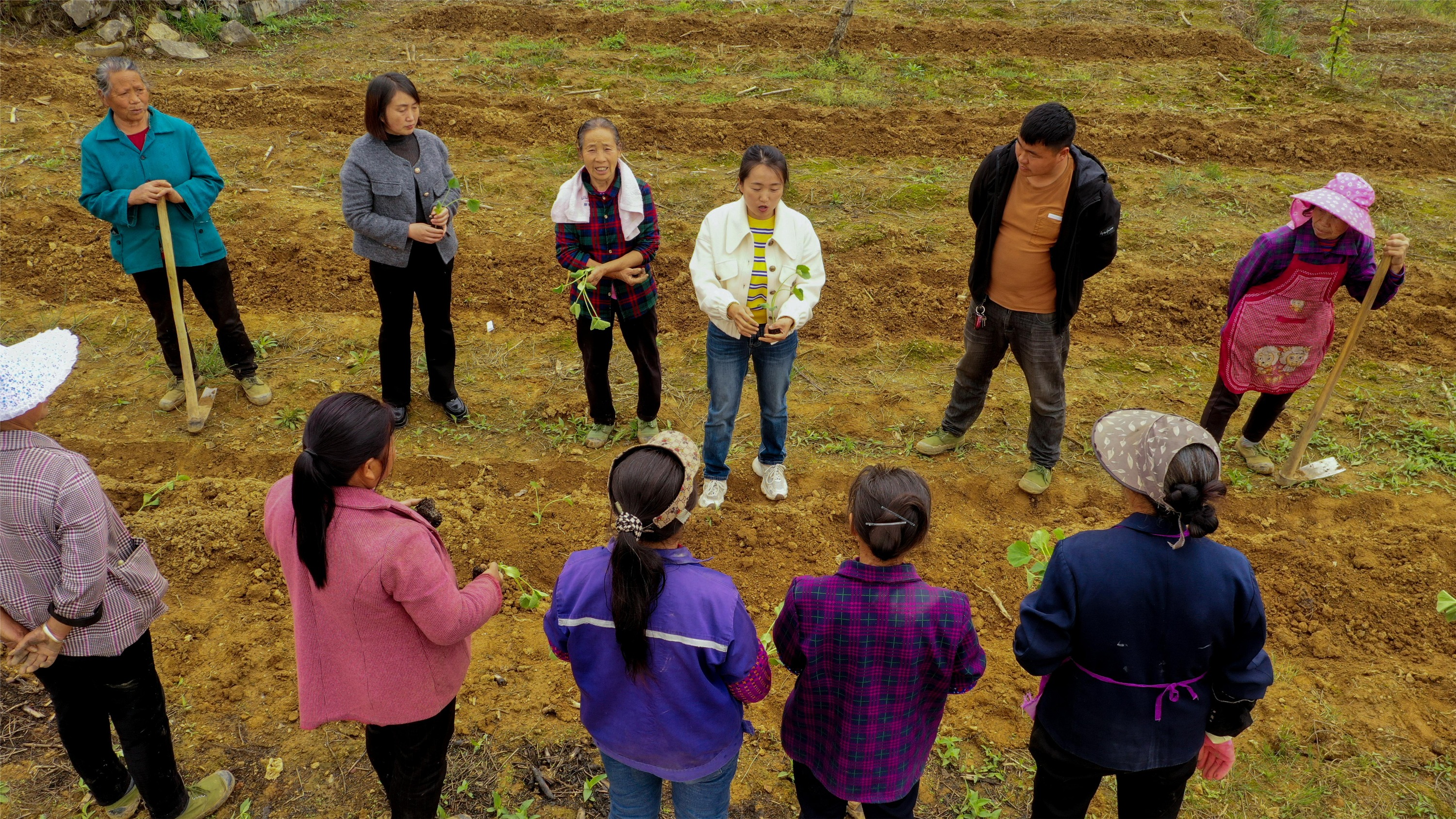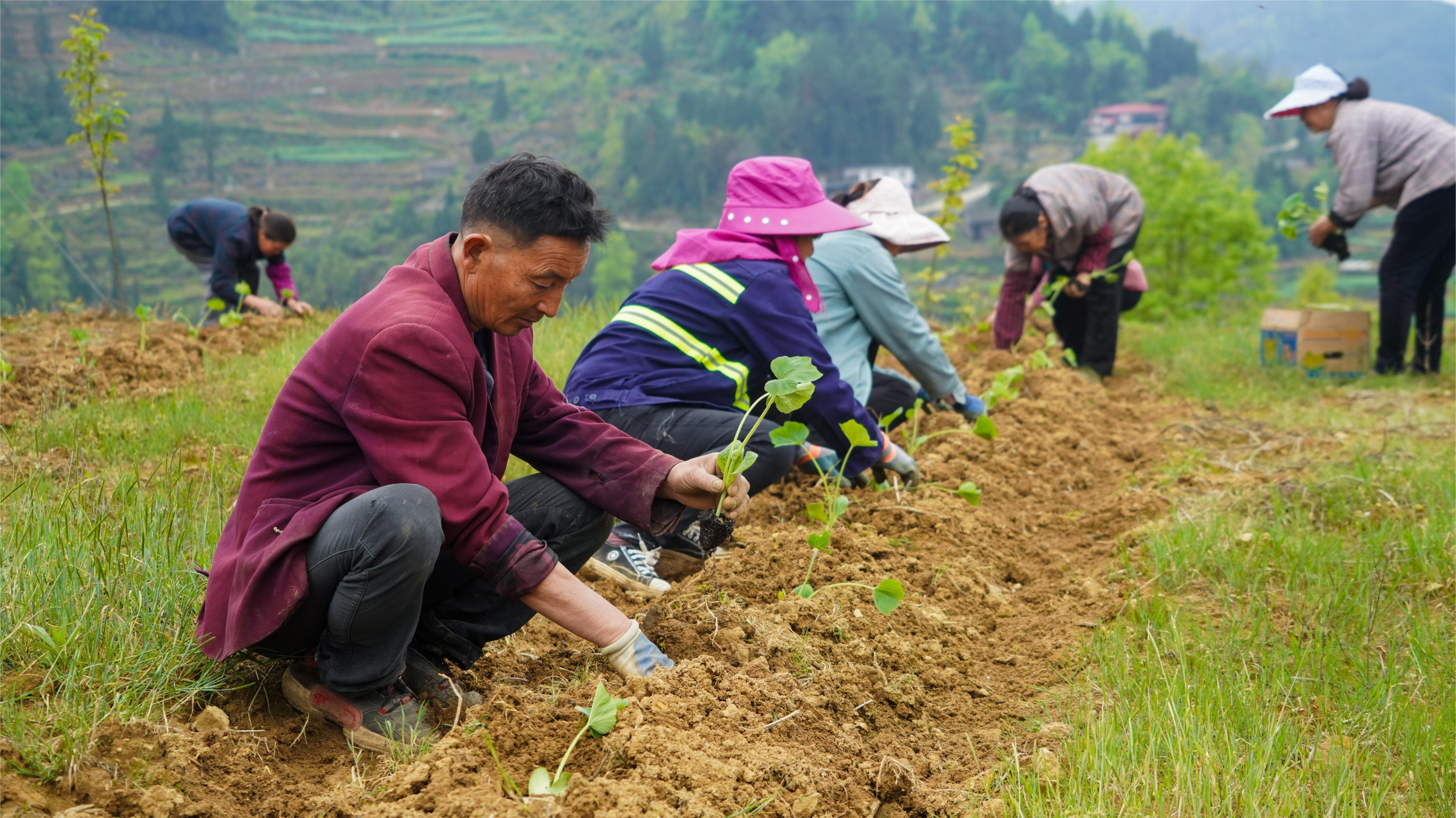 经过培训后,村民们迅速掌握了南瓜种植要领,动作更加娴熟,不一会就移栽了一大片南瓜苗。